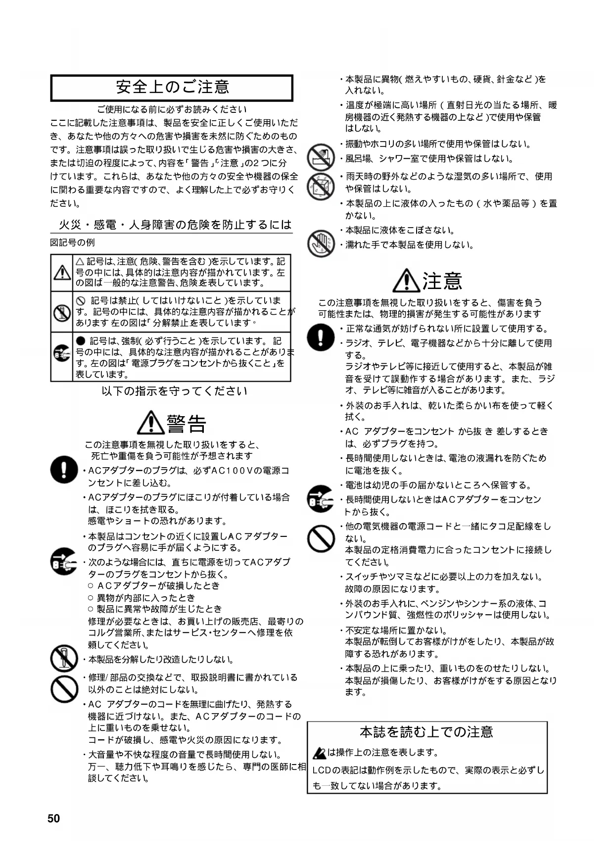 ご使用になる前に必ずお読みください ここに記載した注意事項は、製品を安全に正しくご使用いただ き、あなたや他の方々への危害や損害を未然に防ぐためのもの です。注意事項は誤った取り扱いで生じる危害や損害の大きさ、 または切迫の程度によって、内容を「警告」、「注意」の2つに分 けています。これらは、あなたや他の方々の安全や機器の保全 に関わる重要な内容ですので、よく理解した上で必ずお守りく