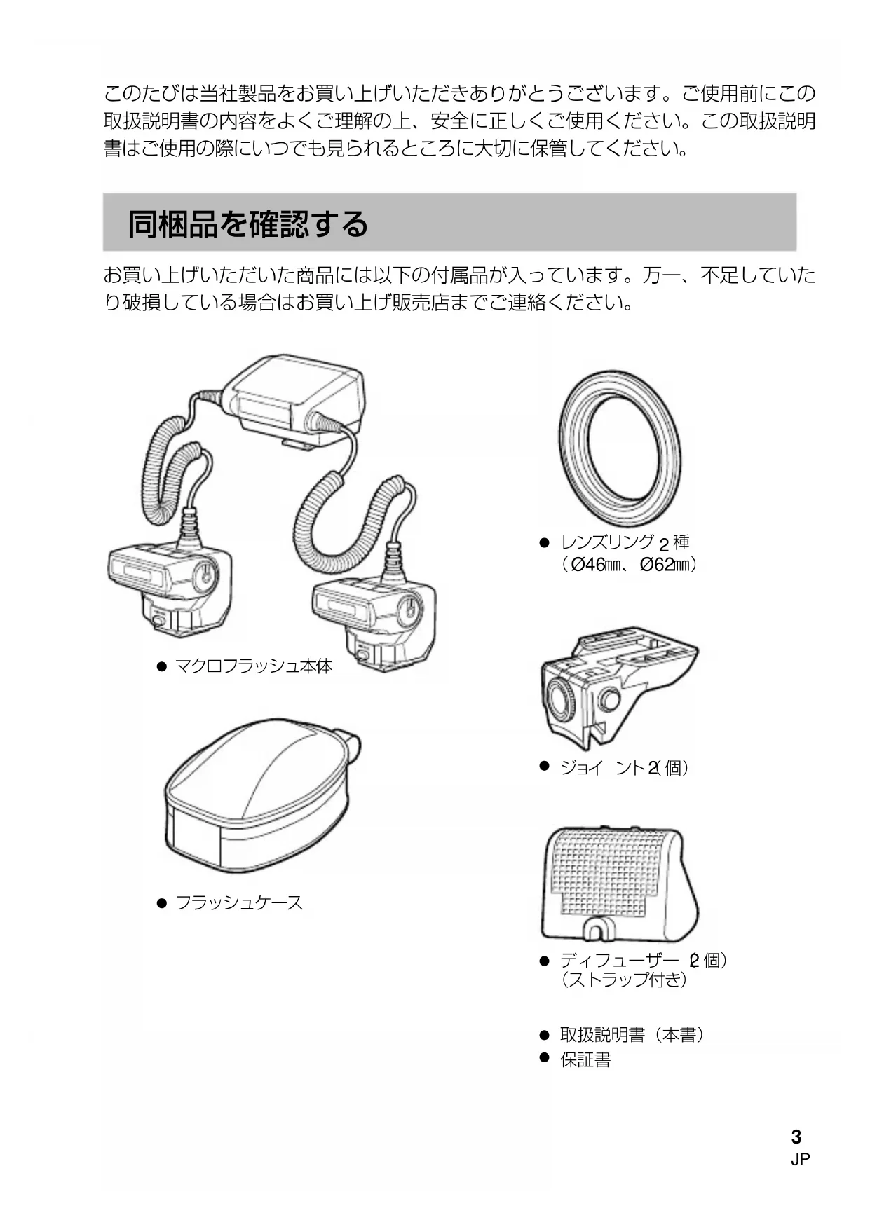 お買い上げいただいた商品には以下の付属品が入っています。万一、不足していた り破損している場合はお買い上げ販売店までご連絡ください。