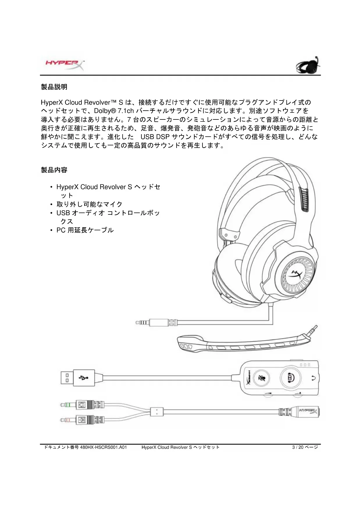 - PC 用延長ケーブルドキュメント番号 480HX-HSCRS001.A01 HyperX Cloud Revolver S ヘッドセット 4 / 20 ページ