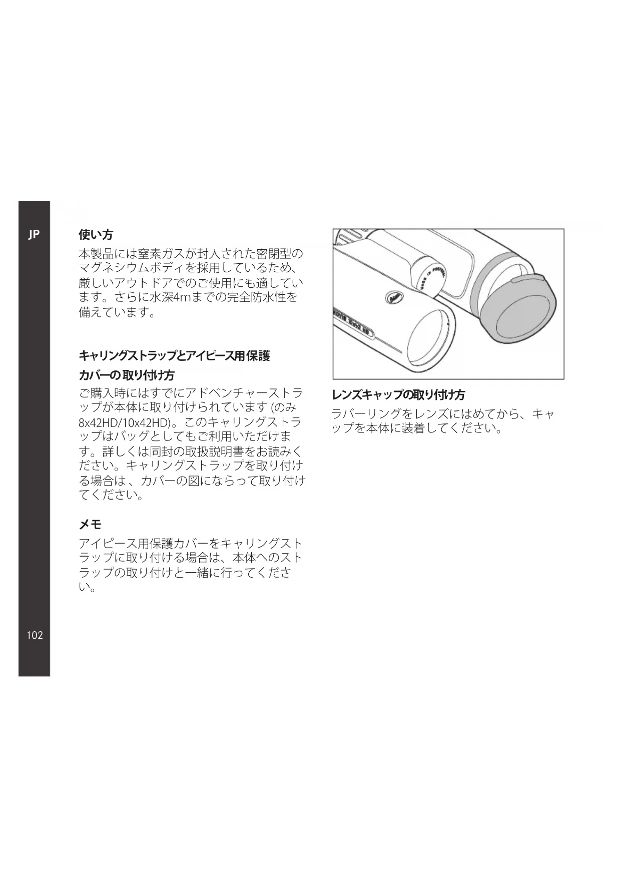8x42HD/10x42HD) 。このキャリングストラ ップはバッグとしてもご利用いただけま す。詳しくは同封の取扱説明書をお読みく ださい。キャリングストラップを取り付け る場合は–、カバーの図にならって取り付け