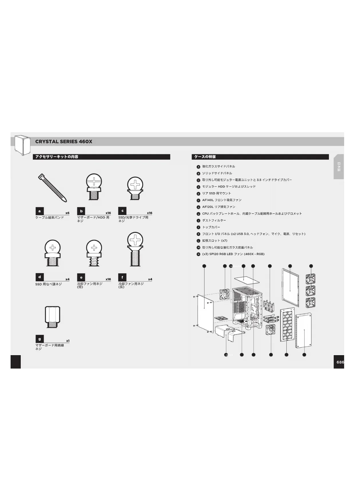 前部 ............................................................................xxmm 上部 ...................................................................................xmm 背部 .................................................................................................... mm ラジエーターの互換性: 前部 .................................................................................. mmmm 上部 .................................................................................................... mm 背部 .................................................................................................... mm 強化ガラスのフロントとサイドパネルを持つ Corsair Crystal Series 460X は、優れた冷 却機能を備えたコンパクトで美しい ATX ケースです。ワイヤーとドライブは、取り外し 可能ツーピース電源ユニットおよび HDD カバーの下に収納されます。Direct Airflow パ ス設計により、ファンは使用していないドライブケージに風を送り込む必要がなく、最も 熱くなるコンポーネントに風を送って静音と冷却を実現します。 Crystal Series 460X - 強化ガラス、コンパクト ATX ミッドタワー PC ケースをご購入いただき、ありがとうございます。 464mm 440mm220mmCRYSTAL SERIES 460X