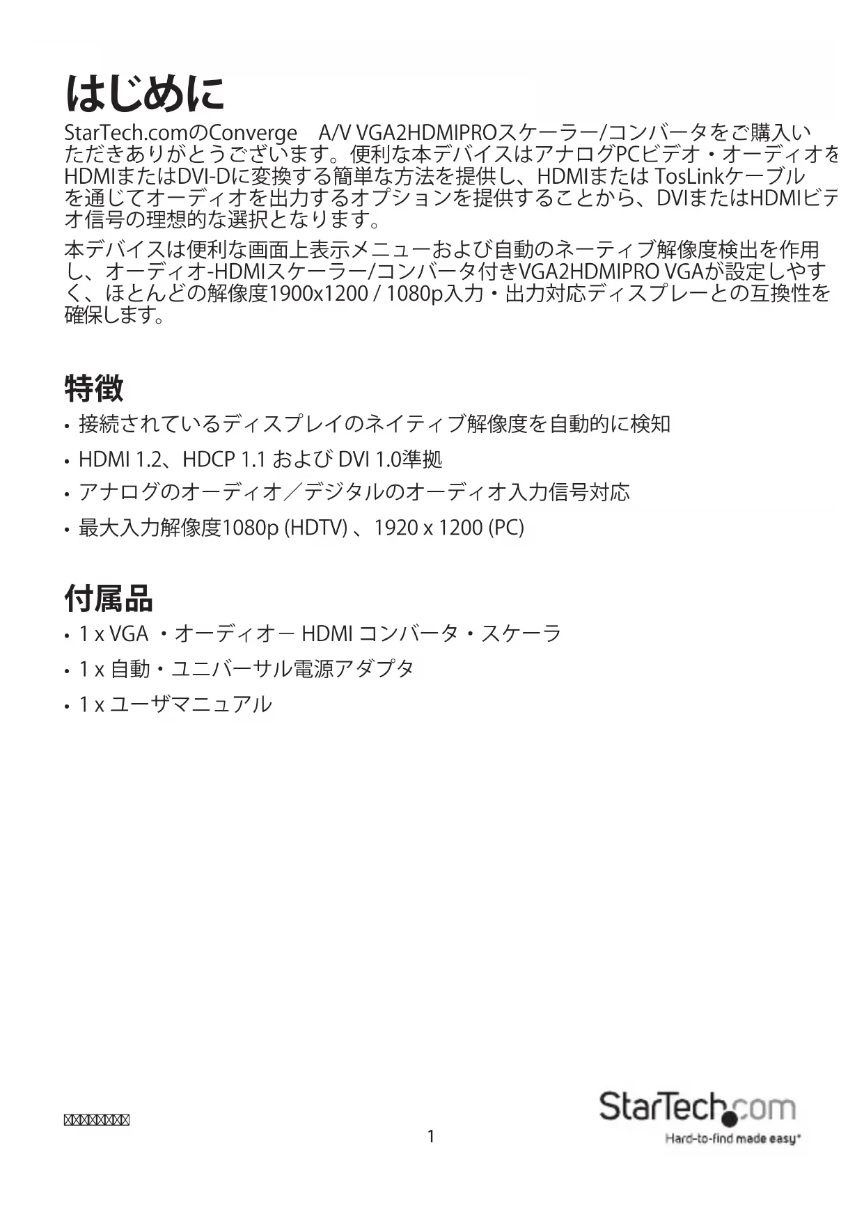 StarTech.comのConverge A/V VGA2HDMIPROスケーラー/コンバータをご購入い ただきありがとうございます。便利な本デバイスはアナログPCビデオ・オーディオを HDMIまたはDVI-Dに変換する簡単な方法を提供し、HDMIまたは TosLinkケーブル を通じてオーディオを出力するオプションを提供することから、DVIまたはHDMIビデ オ信号の理想的な選択となります。 本デバイスは便利な画面上表示メニューおよび自動のネーティブ解像度検出を作用
