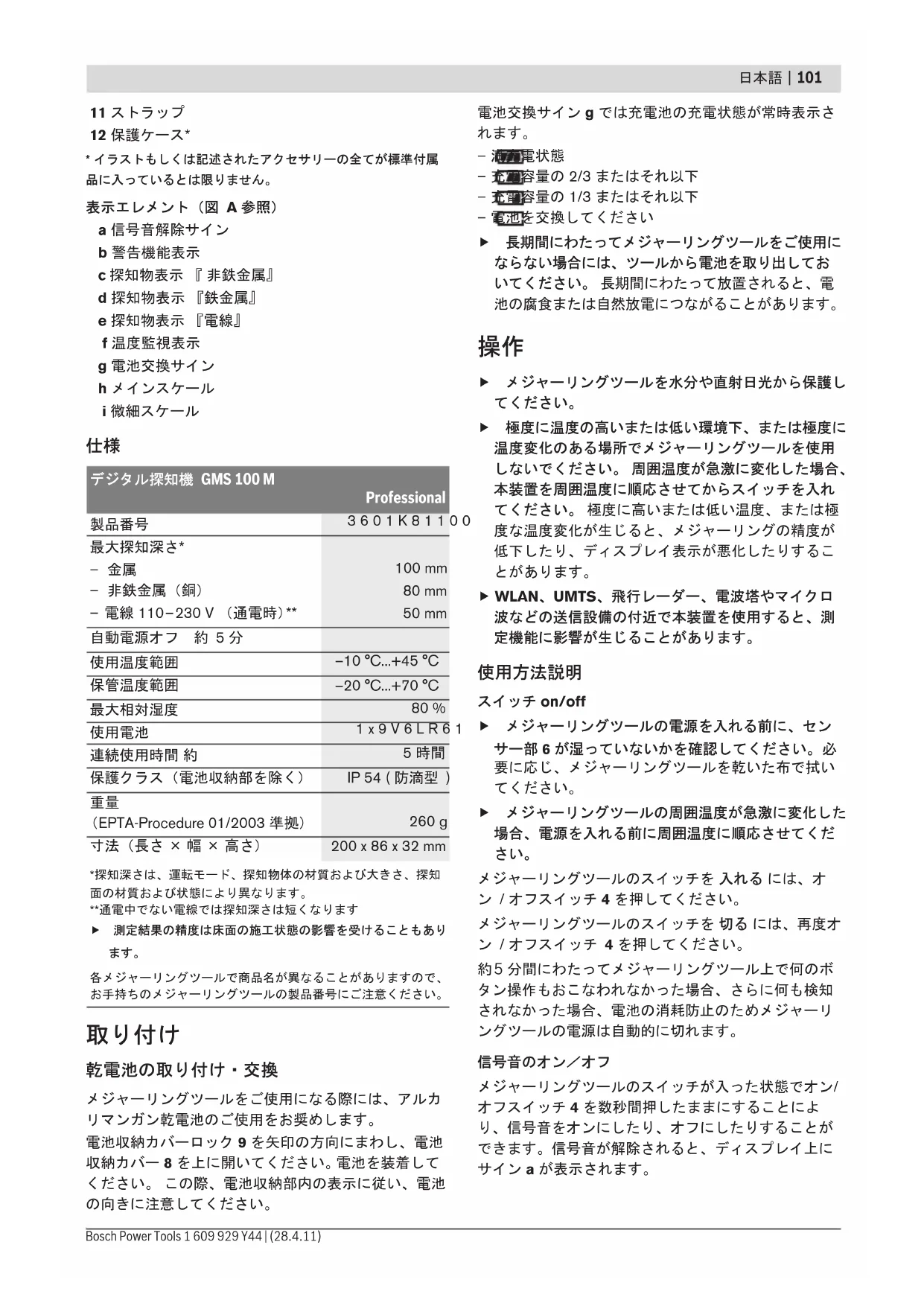 製品および性能について わからないことが起きたときは、必ず読み返してください。 このメジャーリングツールは鉄・非鉄を含有する対象物および導電線の探知に適しています。 以下の番号はイラストページのメジャーリングツール構成図に一致しています。 1 ライトリング2 マーキング用開口部3 ディスプレイ4 電源スイッチ5 接触パッド6 センサー部7 銘板8 電池収納カバー9 電池収納カバーロック10 ストラップ取付部 OBJ_BUCH-1418-001.book Page 100 Thursday, April 28, 2011 9:54 AM日本語 | 101 Bosch Power Tools 1 609 929 Y44 | (28.4.11) 11 ストラップ 12 保護ケース*