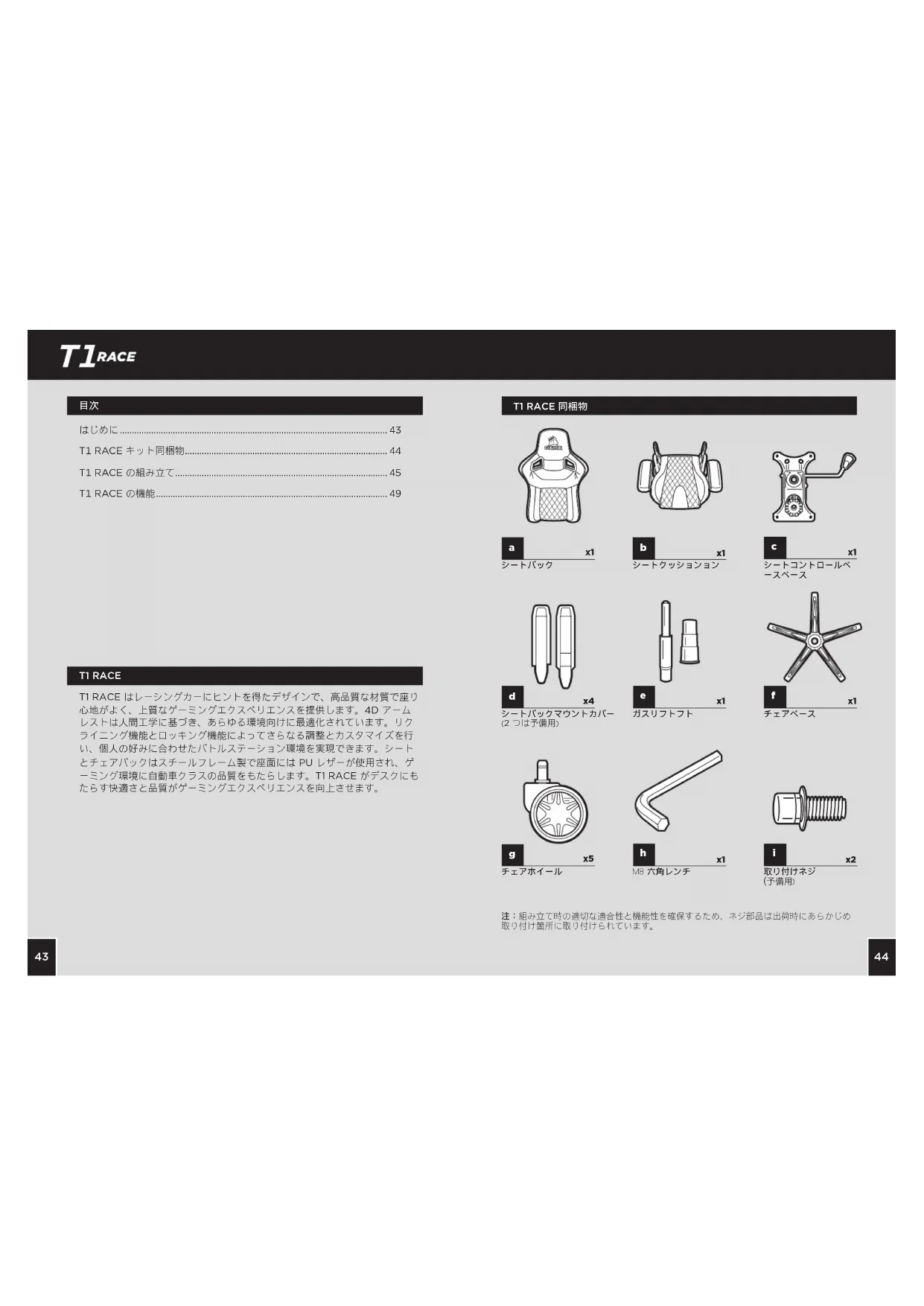 T1 RACE 同梱物 T1 RACE はじめに ............................................................................................................... TRACEキット同梱物 .................................................................................... TRACEの組み立て ........................................................................................ TRACEの機能 ................................................................................................ T1 RACE はレーシングカーにヒントを得たデザインで、高品質な材質で座り 心地がよく、上質なゲーミングエクスペリエンスを提供します。4D アーム レストは人間工学に基づき、あらゆる環境向けに最適化されています。リク ライニング機能とロッキング機能によってさらなる調整とカスタマイズを行 い、個人の好みに合わせたバトルステーション環境を実現できます。シート とチェアバックはスチールフレーム製で座面には PU レザーが使用され、ゲ ーミング環境に自動車クラスの品質をもたらします。T1 RACE がデスクにも たらす快適さと品質がゲーミングエクスペリエンスを向上させます。