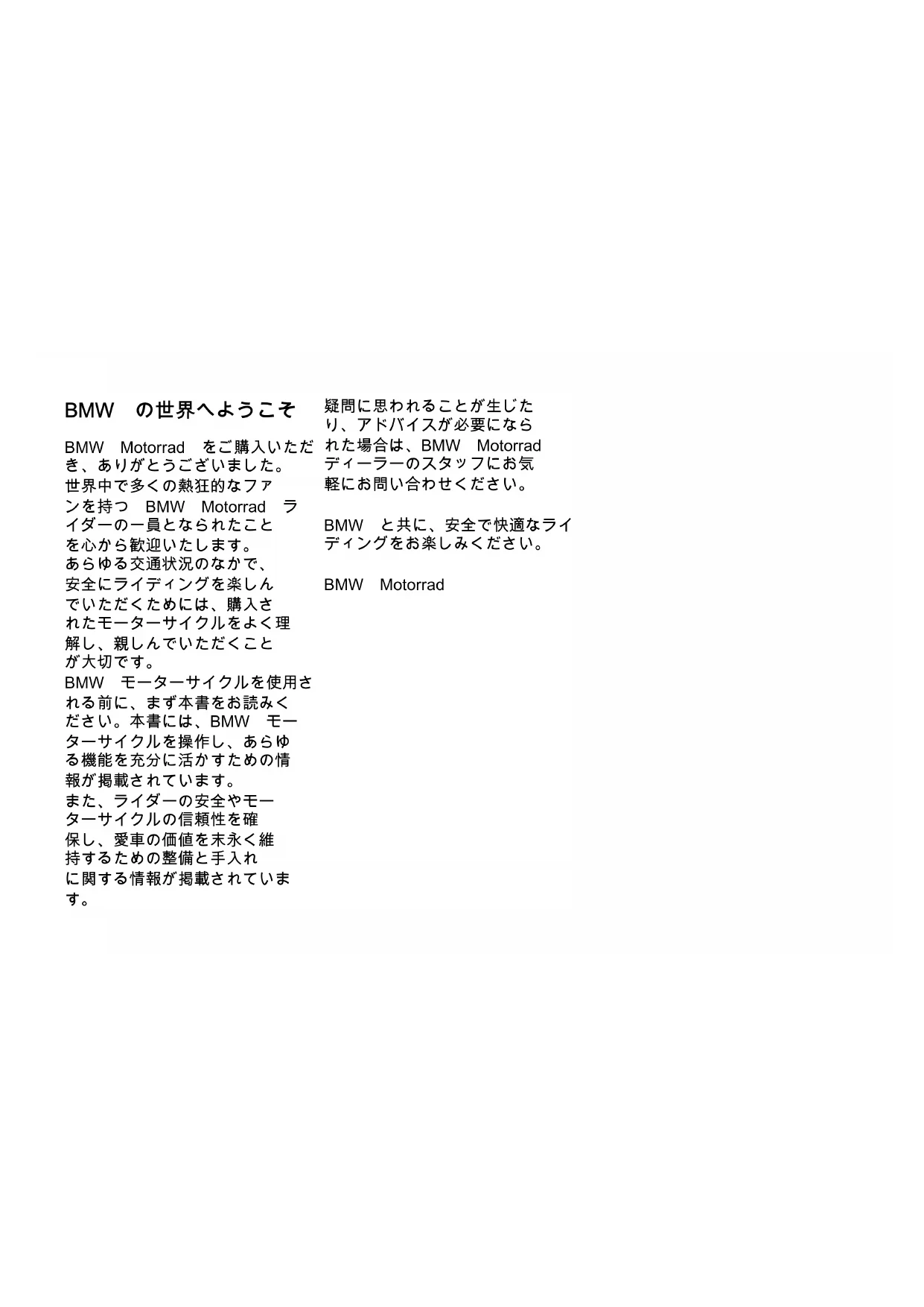 ኤኀዙዙ㓏⦷⦿᧫榊崀᧤ኖኜዐኴ᧥BMW の世界へようこそ BMW Motorrad をご購入いただ き、ありがとうございました。 世界中で多くの熱狂的なファ ンを持つ BMW Motorrad ラ イダーの一員となられたこと を心から歓迎いたします。 あらゆる交通状況のなかで、 安全にライディングを楽しん でいただくためには、購入さ れたモーターサイクルをよく理 解し、親しんでいただくこと