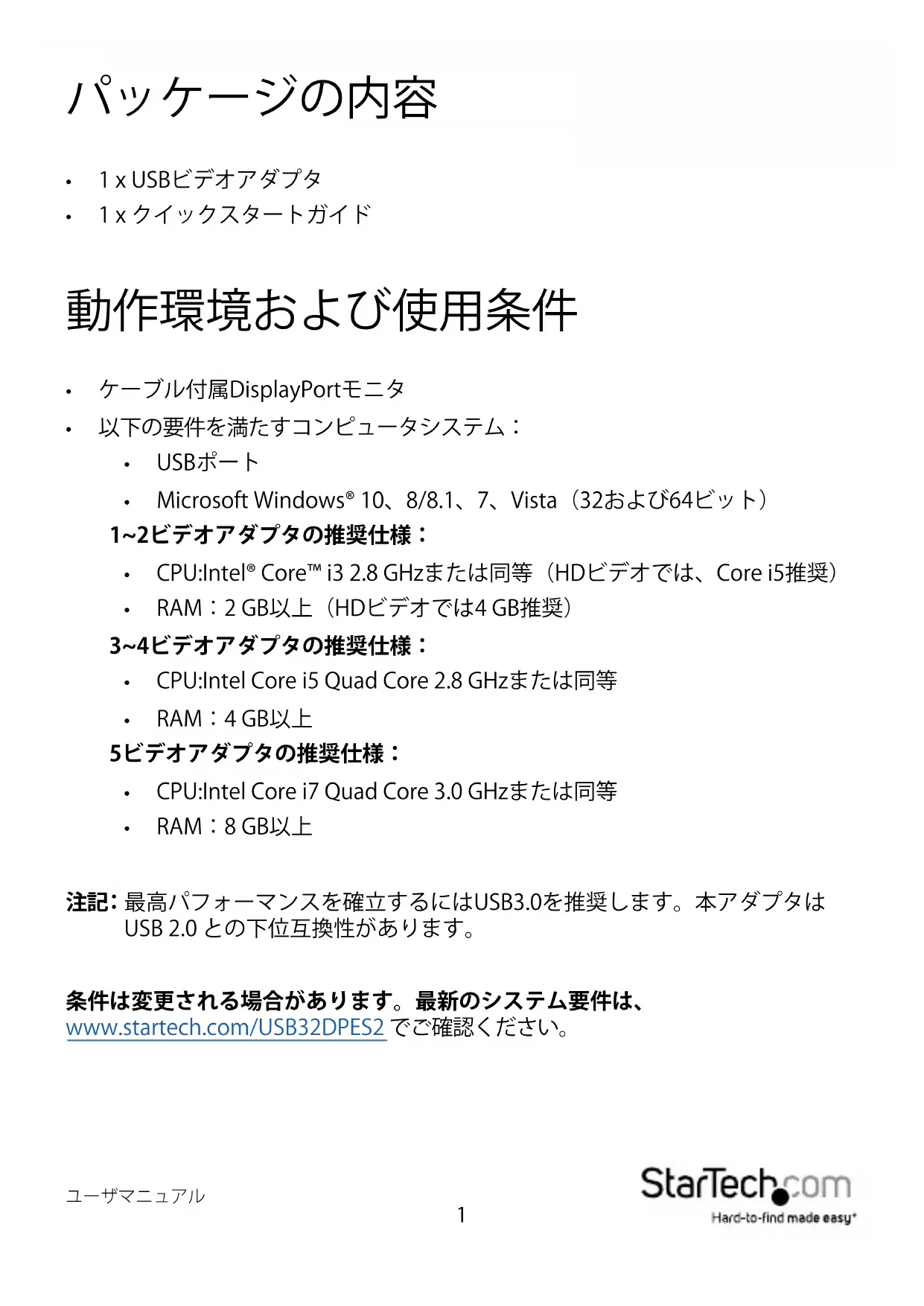 マニュアル改訂日:01/08/2018 DE: Bedienungsanleitung - de.startech.com FR: Guide de l'utilisateur - fr.startech.com ES: Guía del usuario - es.startech.com IT: Guida per l'uso - it.startech.com NL: Gebruiksaanwijzing - nl.startech.com PT: Guia do usuário - pt.startech.com 最新の情報はwww.startech.com/USB32DPES2 でご確認ください。 *実際の製品は写真と異なる場合があります。 USB 3.0 - DisplayPort ビデオアダプタ USB 3.0ビデオアダプタを接続する 前に、必ずStarTech.comウェブサ イトから最のドライバをインスト