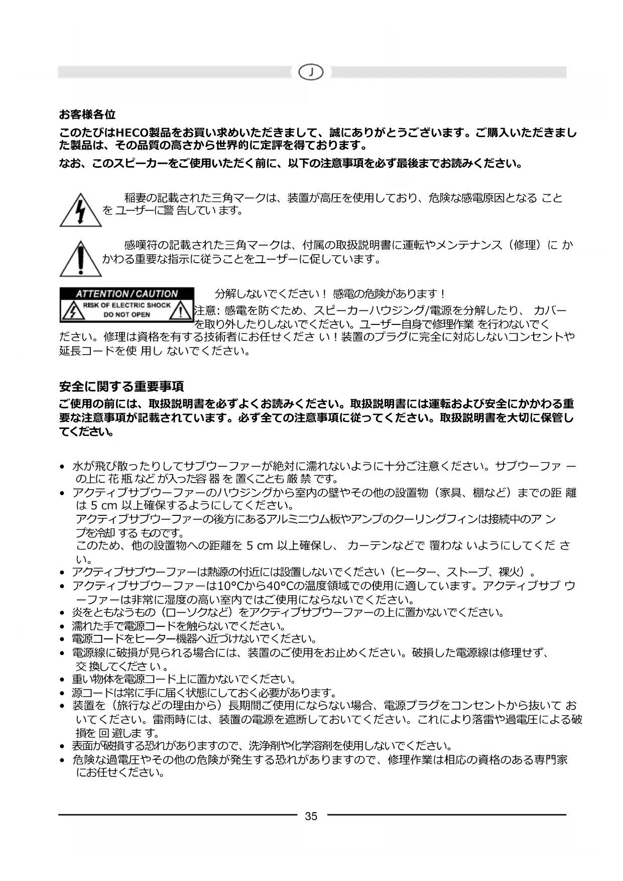 このたびはHECO製品をお買い求めいただきまして、誠にありがとうございます。ご購入いただきまし た製品は、その品質の高さから世界的に定評を得ております。 なお、このスピーカーをご使用いただく前に、以下の注意事項を必ず最後までお読みください。 稲妻の記載された三角マークは、装置が高圧を使用しており、危険な感電原因となる こと を ユーザーに警 告してい ます。 感嘆符の記載された三角マークは、付属の取扱説明書に運転やメンテナンス(修理)に か かわる重要な指示に従うことをユーザーに促しています。 分解しないでください! 感電の危険があります! 注意: 感電を防ぐため、スピーカーハウジング/電源を分解したり、 カバー を取り外したりしないでください。ユーザー自身で修理作業 を行わないでく ださい。修理は資格を有する技術者にお任せくださ い!装置のプラグに完全に対応しないコンセントや 延長コードを使 用し ないでください。