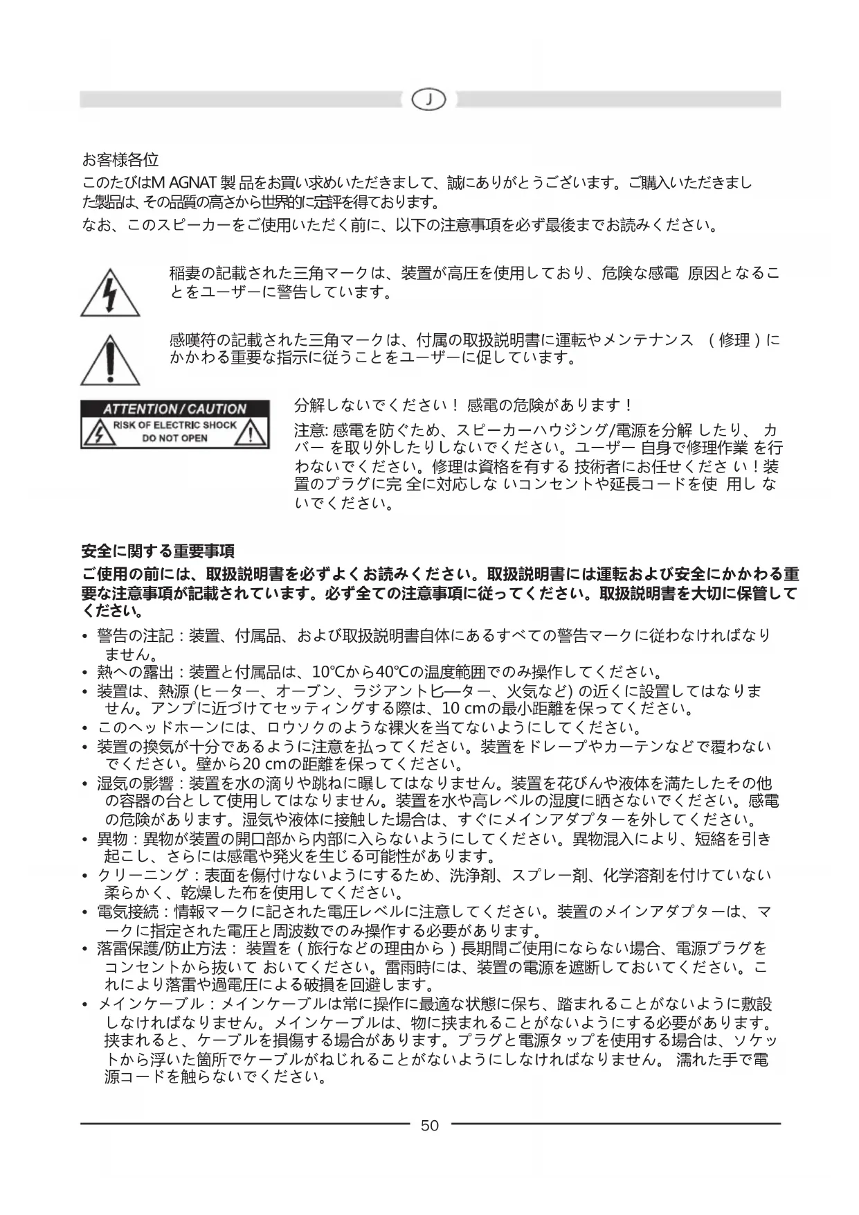 このたびはM AGNAT 製 品をお買い求めいただきまして、誠にありがとうございます。ご購入いただきまし た 製 品 は 、そ の 品 質 の 高 さ か ら 世 界 的 に 定 評 を 得 て お り ま す 。 なお、このスピーカーをご使用いただく前に、以下の注意事項を必ず最後までお読みください。 稲妻の記載された三角マークは、装置が高圧を使用しており、危険な感電 原因となるこ とをユーザーに警告しています。 感嘆符の記載された三角マークは、付属の取扱説明書に運転やメンテナンス (修理)に かかわる重要な指示に従うことをユーザーに促しています。 分解しないでください! 感電の危険があります! 注意: 感電を防ぐため、スピーカーハウジング/電源を分解 したり、 カ バー を取り外したりしないでください。ユーザー 自身で修理作業 を行 わないでください。修理は資格を有する 技術者にお任せくださ い!装 置のプラグに完 全に対応しな いコンセントや延長コードを使 用し な