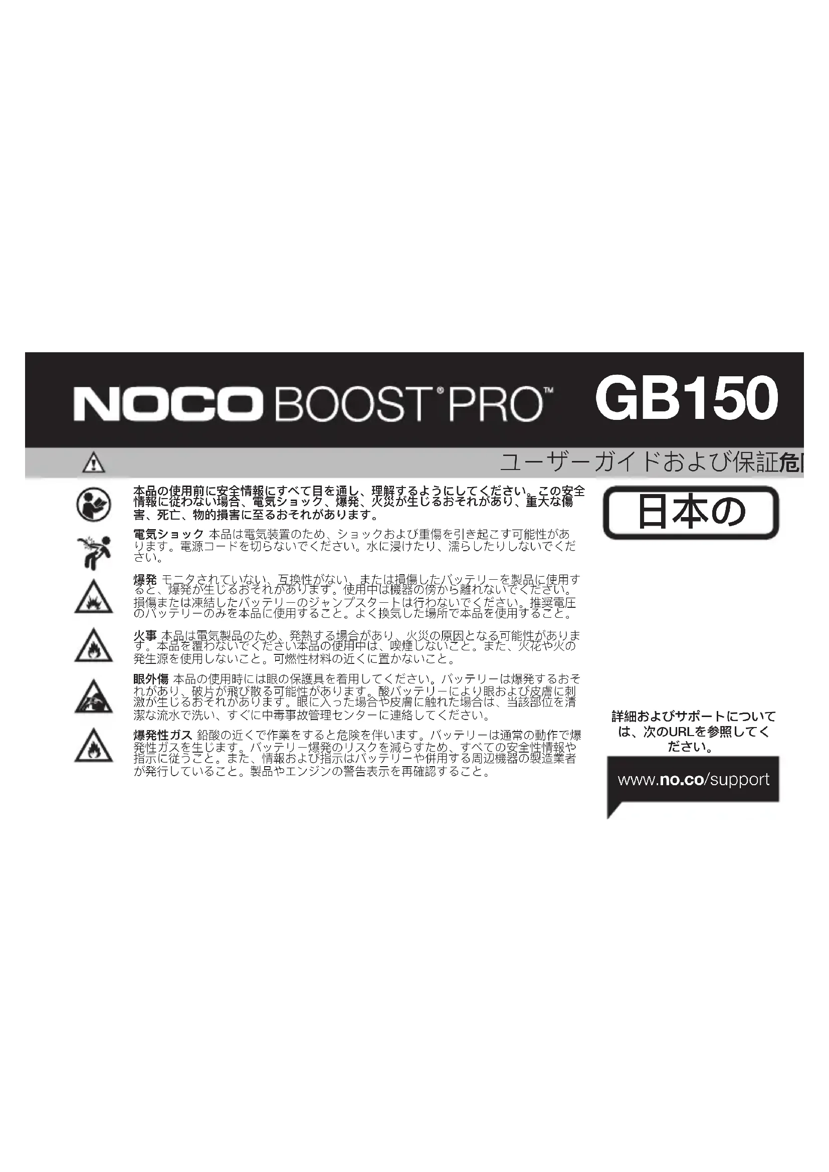 人への危害のおそれ。電源コードやバッテリーケーブルに何らかの損傷がある場合は、本製品を使用しないでください。こ の装置を商用の修理施設で使用することは想定されていません。この装置を使用しないときは、屋内に保管してください。 この装置を使用しないときは、屋外に保管したり放置したりしないでくださいJA 社製の付属品のみが本品に使用できます。NOCO承認済みの付属品以外の使用による安全性および損害について、NOCOは一切の責任 を負いません。 位置 本品に含まれる希硫酸の充電器との接触を避けてください。閉鎖された空間または十分な換気ができない場所で 本品を操作しないでください。本品の上部にバッテリーを置かないこと。正しく配線することで、自動車部品(ボンネット、ドアを含 む)、エンジン部品(ファン、ベルト、プーリーを含む)が動くことによる損傷または負傷や死亡の原因となる危険を回避することが できます。 作動温度 本品は20℃~50℃での使用を想定して設計されています。この範囲外での操作を行わないでください。凍結した バッテリーのジャンプスタートは行わないでください。バッテリの温度が過度に上昇した場合は、速やかに使用を中止してください。 保管 埃または空気中の物質の濃度が高い地域で本品の操作または保管を行わないでください。本品は落下の危険がない平らな場所に保 管してください。乾燥した場所に保管すること。保管時の温度:-20 ºC ~50 ºC(0℃〜+ 25℃の平均温度)いずれの場合も80ºCを超 えないこと。 互換性 本品は12V鉛蓄バッテリにのみ互換性がありま す。他の種類の製品に使用しないでください。他のバッテリの化 学物質 物的損害 を引き起こす 可能性 があります。バッテリをジャンプスタートする前にバッテリ製造業者に連絡してください。バッ テリの化学物質または電圧が不明な場合はバッテリをジャンプスタートしないでください。 バッテリー 本製品に内蔵されているリチ ウムイオンバッテリの交換はNOCO社のみが実施できます。また、使用済みのバッテリは、家庭ごみと分別して廃棄する必要がありま す。ご自身でバッテリの交換を行わないでください。また、損傷したバッテリおよび漏れのあるバッテリを取り扱わないでください。 使用済みのバッテリは、決して家庭ごみとして廃棄しないでください。家庭ごみとしてのバッテリの廃棄は、州および連邦法に基づき 非合法とされています。使用済みのバッテリは、必ずお住まいの地域のバッテリ再利用センターで処理してください。本製品のバッテ リが過剰に熱をもっている場合、臭いを発する場合、変形、損傷がある場合またはその他の異常がある場合は、速やかにすべての使用