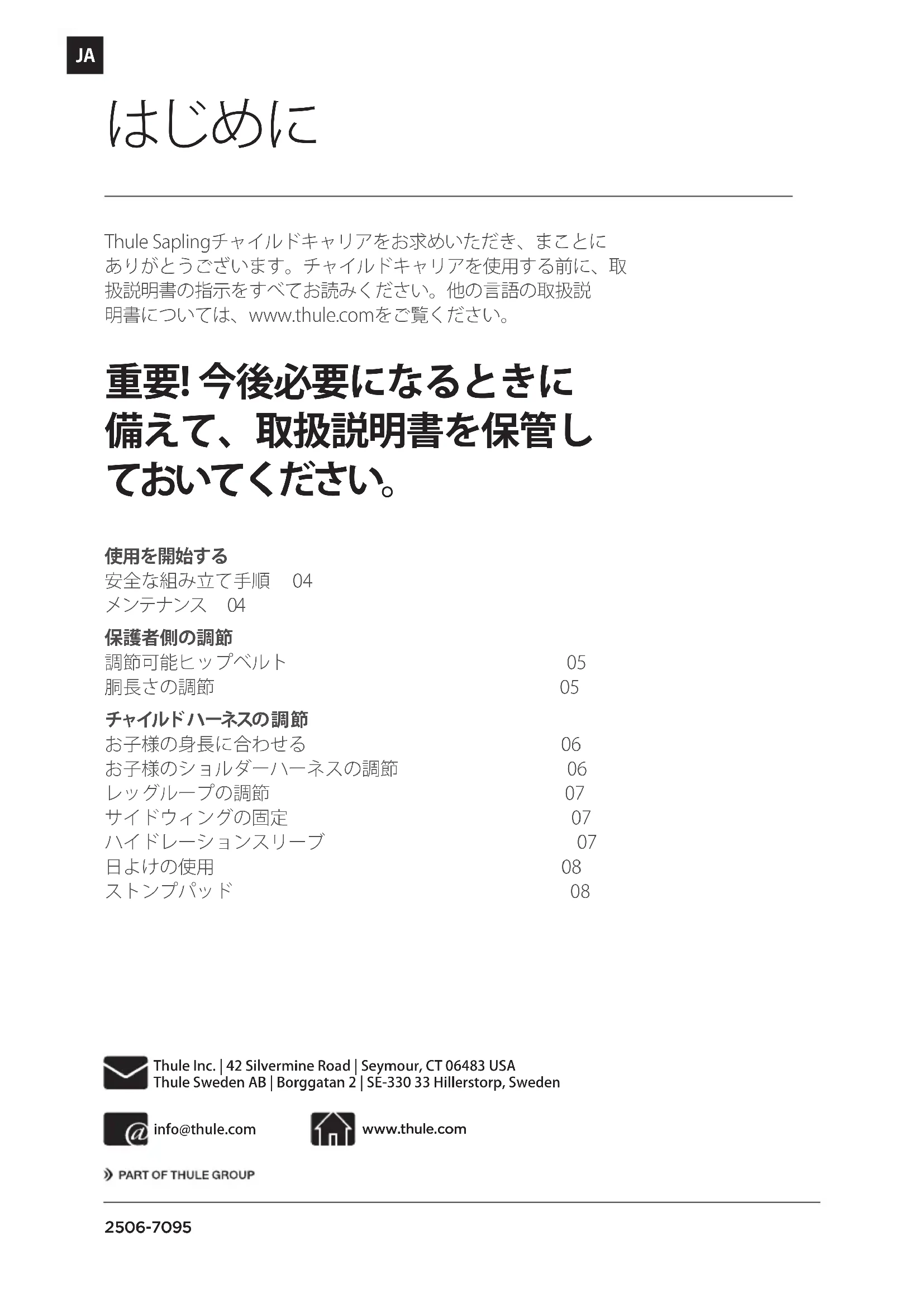調節可能ヒップベルト 05 胴長さの調節 05 チャイルド ハーネスの 調 節 お子様の身長に合わせる 06 お子様のショルダーハーネスの調節 06 レッグループの調節 07 サイドウィングの固定 07 ハイドレーションスリーブ 07 日よけの使用 08 ストンプパッド 08 はじめに3506-7095