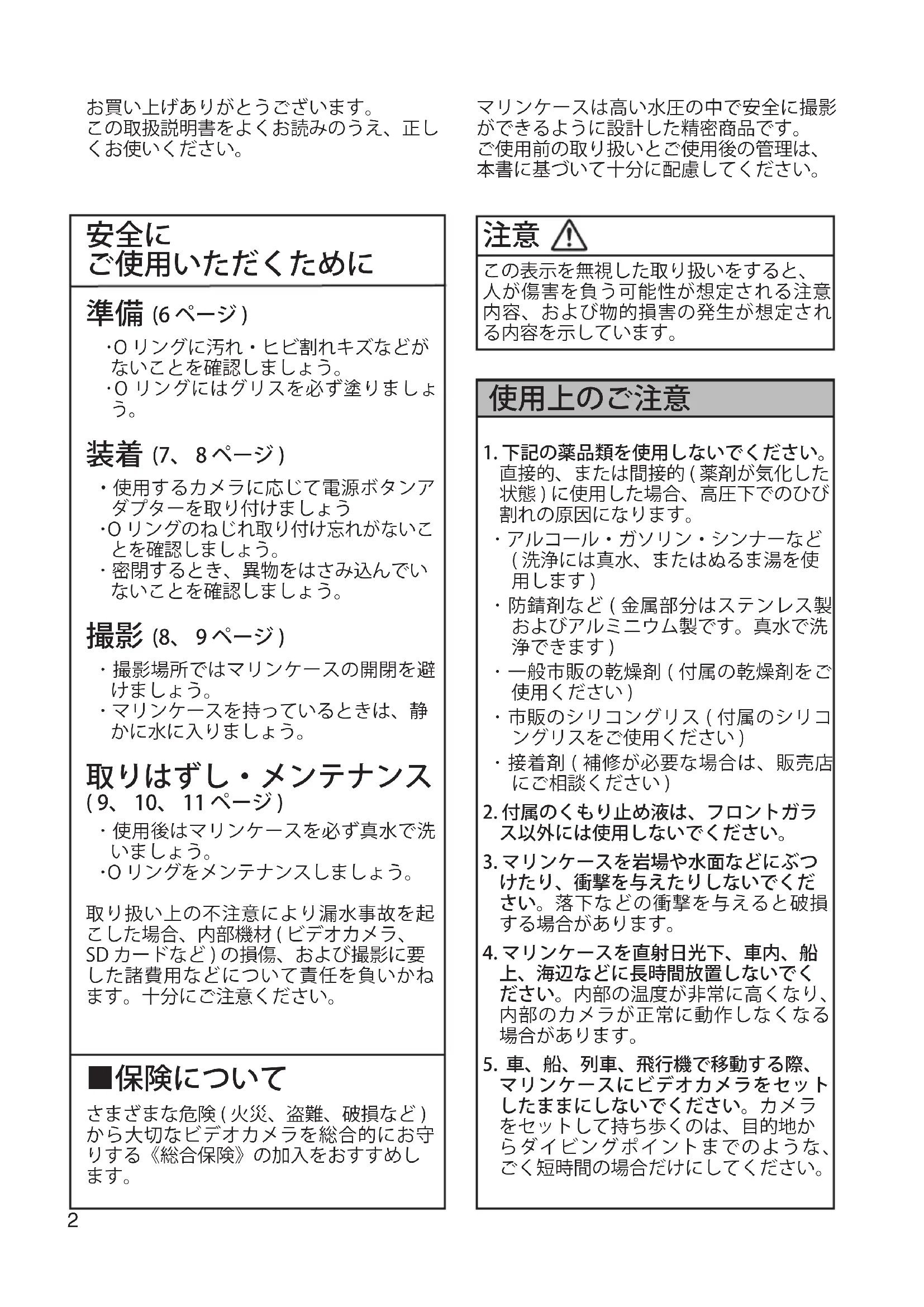 マリンケースは高い水圧の中で安全に撮影 ができるように設計した精密商品です。 ご使用前の取り扱いとご使用後の管理は、 本書に基づいて十分に配慮してください。