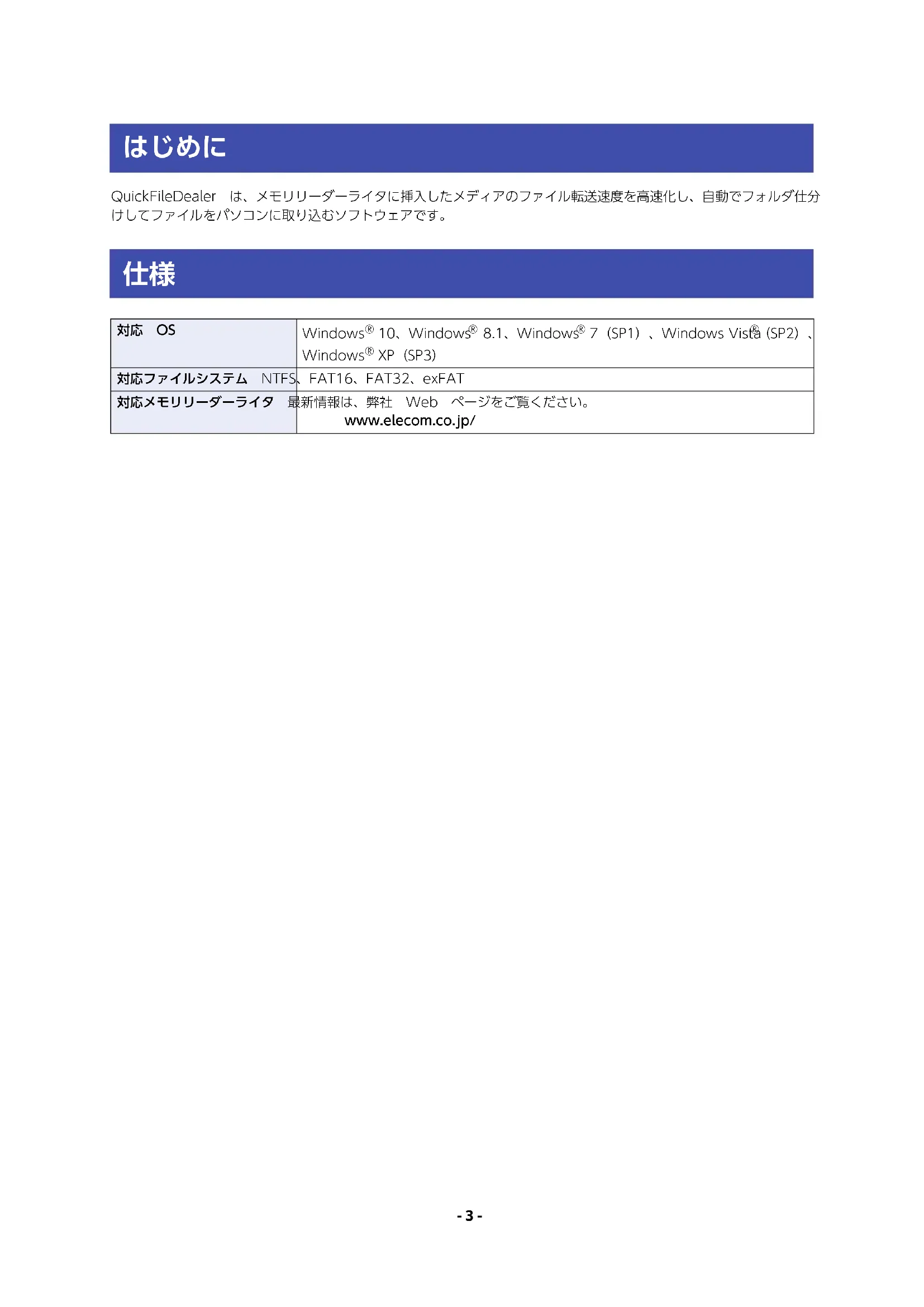 - ユーザーサポートについて 目次- 3 - QuickFileDealer は、メモリリーダーライタに挿入したメディアのファイル転送速度を高速化し、自動でフォルダ仕分 けしてファイルをパソコンに取り込むソフトウェアです。 p. 17