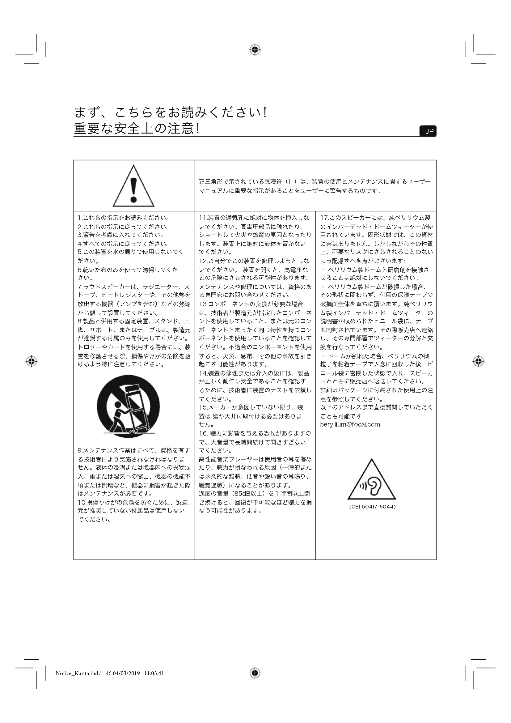 高性能音楽プレーヤーは使用者の耳を傷め たり、聴力が損なわれる原因(一時的また は永久的な難聴、低音や鋭い音の耳鳴り、 聴覚過敏)になることがあります。 過度の音量(85dB以上)を1時間以上聞 き続けると、回復が不可能なほど聴力を損 なう可能性があります。 17.このスピーカーには、純ベリリウム製 のインバーテッド・ドームツィーターが使 用されています。固形状態では、この資材 に害はありません。しかしながらその性質 上、不要なリスクにさらされることのない よう配慮すべき点がございます: ・ ベリリウム製ドームと研磨剤を接触さ せることは絶対にしないでください。 ・ ベリリウム製ドームが破損した場合、 その形状に関わらず、付属の保護テープで 破損面全体を直ちに覆います。純ベリリウ ム製インバーテッド・ドームツィーターの 説明書が収められたビニール袋に、テープ も同封されています。その際販売店へ連絡 し、その専門部署でツィーターの分解と交 換を行なってください。 ・ ドームが割れた場合、ベリリウムの微 粒子を粘着テープで入念に回収した後、ビ ニール袋に密閉した状態で入れ、スピーカ ーとともに販売店へ返送してください。 詳細はパッケージに付属された使用上の注 意を参照してください。 以下のアドレスまで直接質問していただく