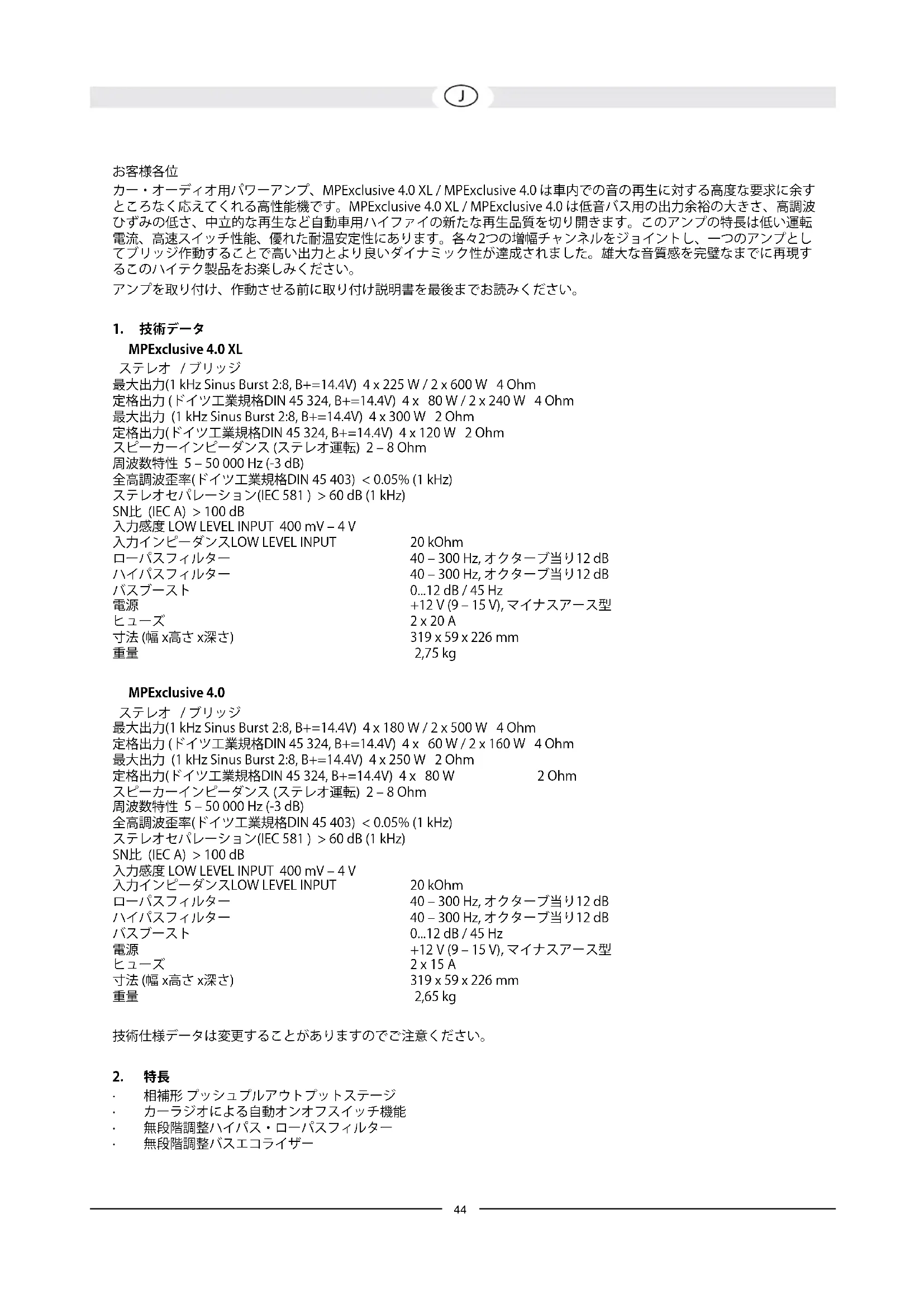 MPExclusive4.0XL ステレオ / ブリッジ 最大出力(1 kHz Sinus Burst 2:8, B+=14.4V) 4 x 225 W / 2 x 600 W 4 Ohm 定格出力 (ドイツ工業規格DIN 45 324, B+=14.4V) 4 x 80 W / 2 x 240 W 4 Ohm 最大出力 (1 kHz Sinus Burst 2:8, B+=14.4V) 4 x 300 W 2 Ohm 定格出力(ドイツ工業規格DIN 45 324, B+=14.4V) 4 x 120 W 2 Ohm スピーカーインピーダンス (ステレオ運転) 2 – 8 Ohm 周波数特性 5 – 50 000 Hz (-3 dB) 全高調波歪率(ドイツ工業規格DIN 45 403) < 0.05% (1 kHz) ステレオセパレーション(IEC 581 ) > 60 dB (1 kHz) SN比 (IEC A) > 100 dB 入力感度 LOW LEVEL INPUT 400 mV – 4 V 入力インピーダンスLOW LEVEL INPUT 20 kOhm ローパスフィルター 40 – 300 Hz, オクターブ当り12 dB ハイパスフィルター 40 – 300 Hz, オクターブ当り12 dB バスブースト 0...12 dB / 45 Hz 電源 +12 V (9 – 15 V), マイナスアース型 ヒューズ 2 x 20 A 寸法 (幅 x高さ x深さ) 319 x 59 x 226 mm 重量 2,75 kg MPExclusive4.0 ステレオ / ブリッジ 最大出力(1 kHz Sinus Burst 2:8, B+=14.4V) 4 x 180 W / 2 x 500 W 4 Ohm 定格出力 (ドイツ工業規格DIN 45 324, B+=14.4V) 4 x 60 W / 2 x 160 W 4 Ohm 最大出力 (1 kHz Sinus Burst 2:8, B+=14.4V) 4 x 250 W 2 Ohm 定格出力(ドイツ工業規格DIN 45 324, B+=14.4V) 4 x 80 W 2 Ohm スピーカーインピーダンス (ステレオ運転) 2 – 8 Ohm 周波数特性 5 – 50 000 Hz (-3 dB) 全高調波歪率(ドイツ工業規格DIN 45 403) < 0.05% (1 kHz) ステレオセパレーション(IEC 581 ) > 60 dB (1 kHz) SN比 (IEC A) > 100 dB 入力感度 LOW LEVEL INPUT 400 mV – 4 V 入力インピーダンスLOW LEVEL INPUT 20 kOhm ローパスフィルター 40 – 300 Hz, オクターブ当り12 dB ハイパスフィルター 40 – 300 Hz, オクターブ当り12 dB バスブースト 0...12 dB / 45 Hz 電源 +12 V (9 – 15 V), マイナスアース型 ヒューズ 2 x 15 A 寸法 (幅 x高さ x深さ) 319 x 59 x 226 mm 重量 2,65 kg 技術仕様データは変更することがありますのでご注意ください。