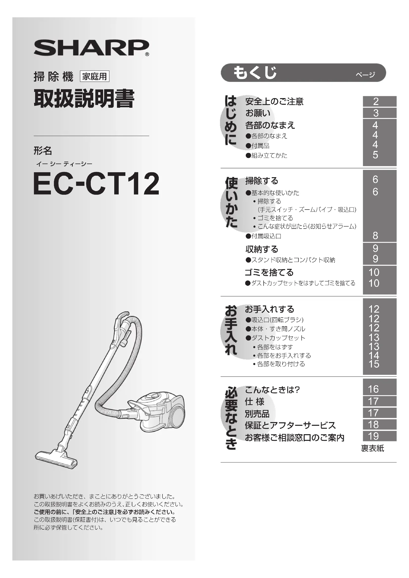 EC-CT12_6th EC-CT12_6th.indd 2 16/09/07 9:46製品登録の オンラインでの各種サポートサービスをご利用いただくために、〈SHARP i CLUB〉でご愛用製品の登録をお願いいたします。(登録無料) http://iclub.sharp.co.jp/m/ スマートフォンや携帯電話はこちらからお問い合わせ先お問い合わせの前にもう一度「こんなときは?」(16ページ)をご確認ください。お客様ご相談窓口(19ページ)よりお問い合わせください。■ 製品の「よくあるご質問」への回答を 24時間音声ガイダンスでご案内 (電話オペレーターにはつながりません) 自動音声案内 フリーダイヤル(携帯電話からもご利用いただけます) 0120 - 001 - 252 http://www.sharp.co.jp/support/cleaner/ シャープ お問い合わせ 掃除機