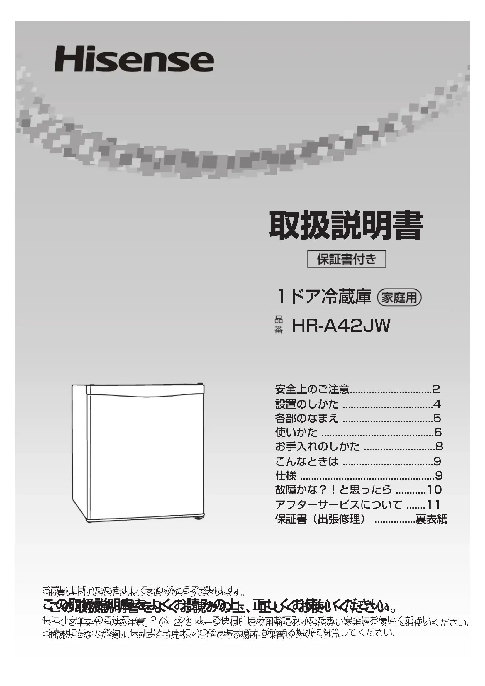 ● メールによるお問い合わせ 電子メールでのお問い合わせは http://www.hisense.co.jp のお問い合わせのページで受け付けています。お客様のご連絡先、型番、ご購入年月日、お買い上げ店、故障状況を詳しく記載してください。受付時間:24 時間受付。土日・祝祭日を挟んだ場合、およびご質問の内容によっては、回答までに日数がかかる場合があります。あらかじめご了承ください。サポート受付に関しては変更させていただく場合がございます。弊社のホームページでサポート時間などをご確認の上、ご利用なさるようお願いいたします。 ハイセンス サポートセンター 0120-033-973HR-A42JW 1ドア冷蔵庫 この保証書は本書に明示した期間、条件のもとにおいて無料修理をお約束するものです。従ってこの保証書によって、お客様の法律上の権利を制限するものではありません。保証期間経過後の修理や補修用性能部品の保有期間については、取扱説明書の「アフターサービスについて」をご覧ください。 お買い上げ店住 所・店 名・電 話長年ご使用の冷蔵庫の点検をぜひ!このような症状はありませんか?● 電源コードや電源プラグが異常に熱い。● 電源コードに深い傷や変形がある。● 焦げ臭いニオイがする。● 冷蔵庫底面にいつも水がたまっている。● ビリビリと電気を感じる。● その他、異常・故障がある。 異常があればご使用中止事故防止のため、電源プラグをコンセントから抜いて、必ずお買い上げの販売店に点検・修理をご依頼くだ