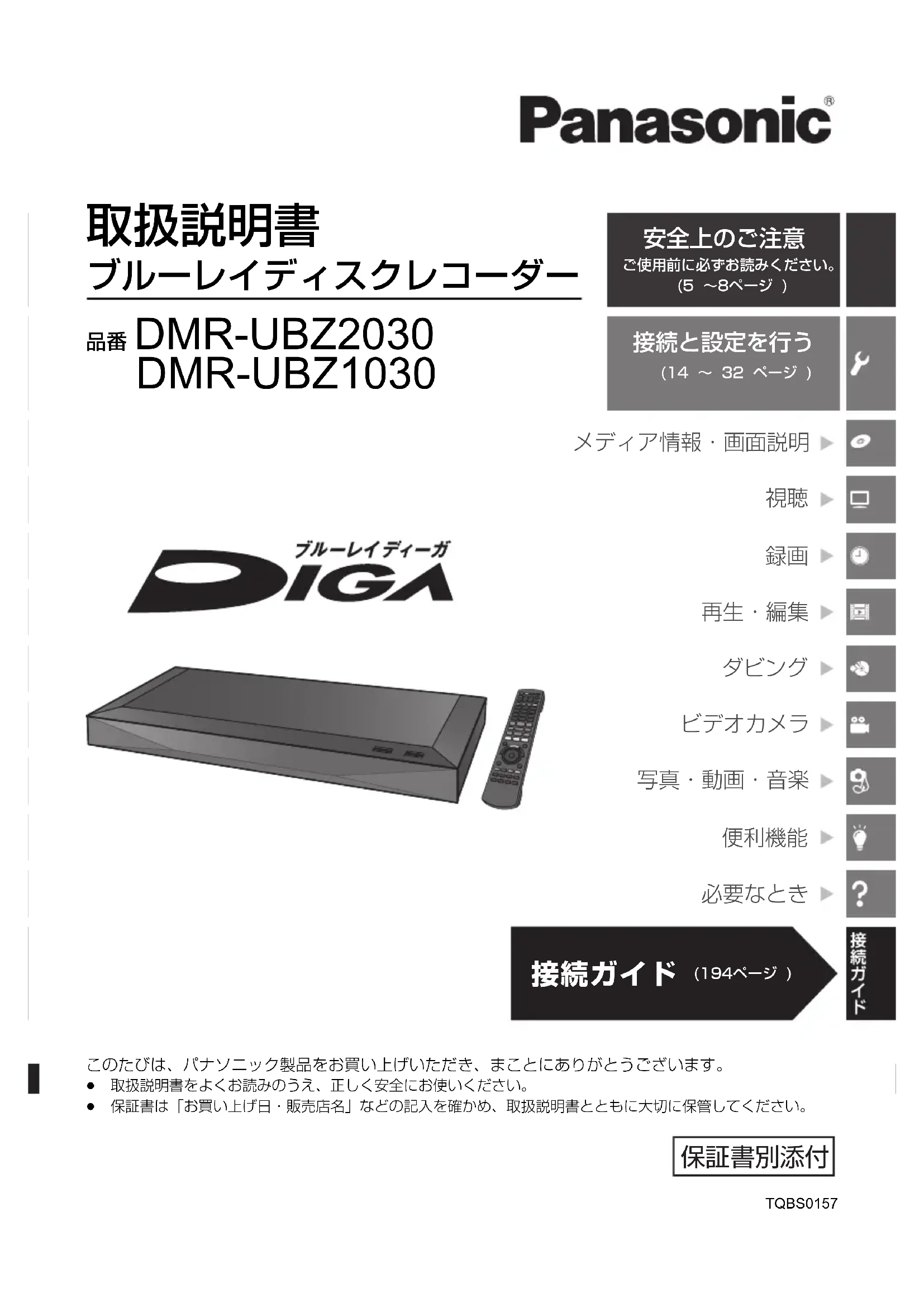 ブルーレイディスクレコーダー 品番DMR-UBZ2030このたびは、パナソニック製品をお買い上げいただき、まことにありがとうございます。≥ 取扱説明書をよくお読みのうえ、正しく安全にお使いください。≥ 保証書は「お買い上げ日・販売店名」などの記入を確かめ、取扱説明書とともに大切に保管してください。TQBS0157(14 〜 32 ページ )ご使用前に必ずお読みください。(5 〜8ページ ) (194ページ ) DMR-UBZ1030 until 2017/8/25 TQBS0157.book 1 ページ 2017年8月9日 水曜日 午後4時8分2 TQBS0157