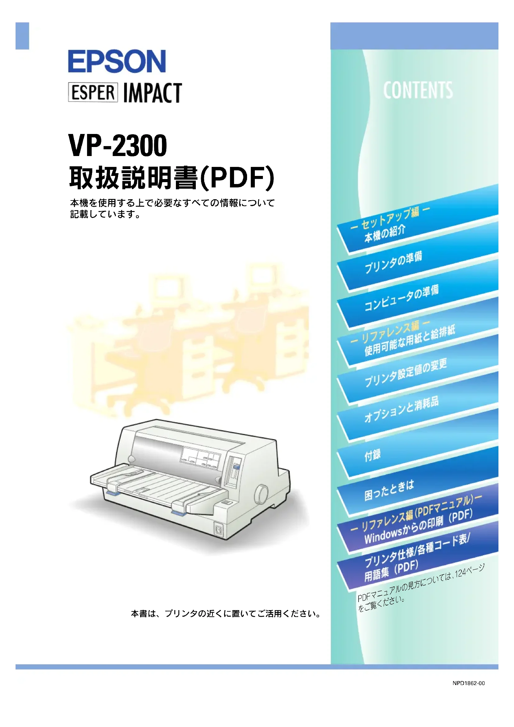 NPD1862-00 本書は、プリンタの近くに置いてご活用ください。 VP-2300 PDFマニュアルの見方については、 124ページ をご覧ください。取扱説明書の種類と使い方