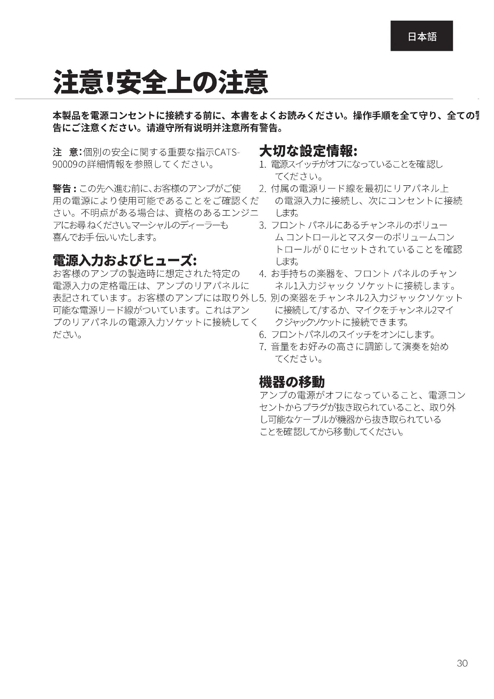 アンプの電源がオフになっていること、電源コン セントからプラグが抜き取られていること、取り外 し可能なケーブルが機器から抜き取られている ことを確 認してから移 動してください。 注 意:個別の安全に関する重要な指示CATS- 90009の詳細情報を参照してください。 警告 : この先へ進む前に、お客様のアンプがご使 用の電源により使用可能であることをご確認くだ さい。不明点がある場合は、資格のあるエンジニ アにお尋 ねください。マーシャルのディーラーも 喜んでお手 伝いいたします。 電源入力およびヒューズ: お客様のアンプの製造時に想定された特定の 電源入力の定格電圧は、アンプのリアパネルに 表記されています。お客様のアンプには取り外し 可能な電源リード線がついています。これはアン プのリアパネルの電源入力ソケットに接続してく