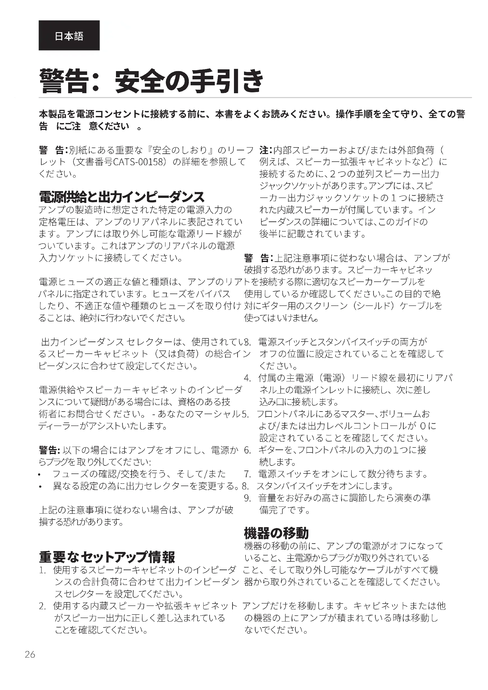電源供給と出力インピーダンス アンプの製造時に想定された特定の電源入力の 定格電圧は、アンプのリアパネルに表記されてい ます。アンプには取り外し可能な電源リード線が ついています。これはアンプのリアパネルの電源 入力ソケットに接続してください。 電源ヒューズの適正な値と種類は、アンプのリア パネルに指定されています。ヒューズをバイパス したり、不適正な値や種類のヒューズを取り付け ることは、絶対に行わないでください。 出力インピーダンス セレクターは、使用されてい るスピーカーキャビネット(又は負荷)の総合イン ピ ー ダンス に 合 わ せて 設 定してくだ さい 。 電源供給やスピーカーキャビネットのインピーダ ンスについて疑問がある場合には、資格のある技 術者にお問合せください。 - あなたのマーシャル デ ィ ー ラ ー が ア シ ス ト い た し ま す 。 警告: 以下の場合にはアンプをオフにし、電源か らプラグを 取 り外してくだ さい :