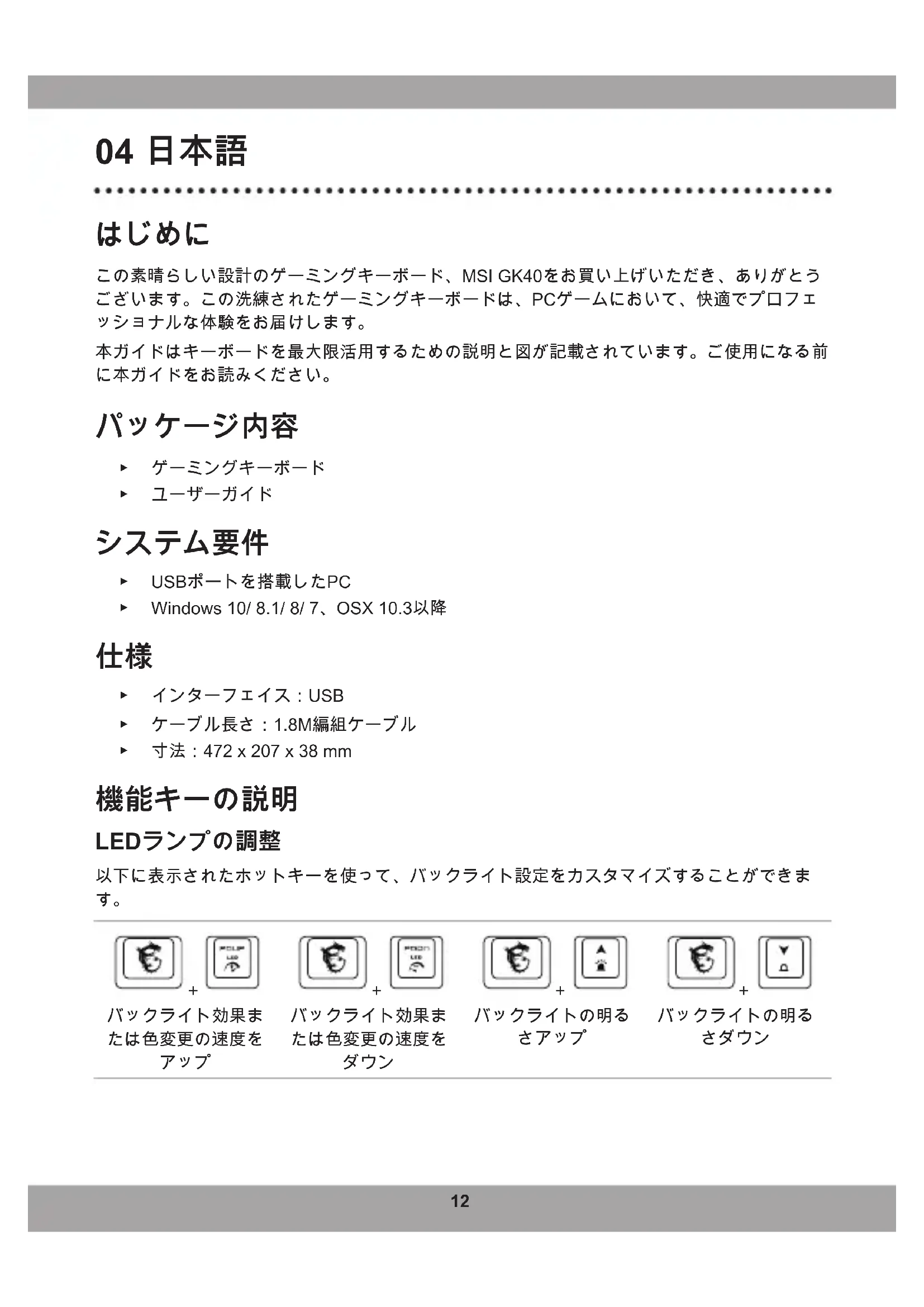 この素晴らしい設計のゲーミングキーボード、MSIGK40をお買い上げいただき、ありがとう ございます。この洗練されたゲーミングキーボードは、PCゲームにおいて、快適でプロフェ ッショナルな体験をお届けします。 本ガイドはキーボードを最大限活用するための説明と図が記載されています。ご使用になる前 に本ガイドをお読みください。