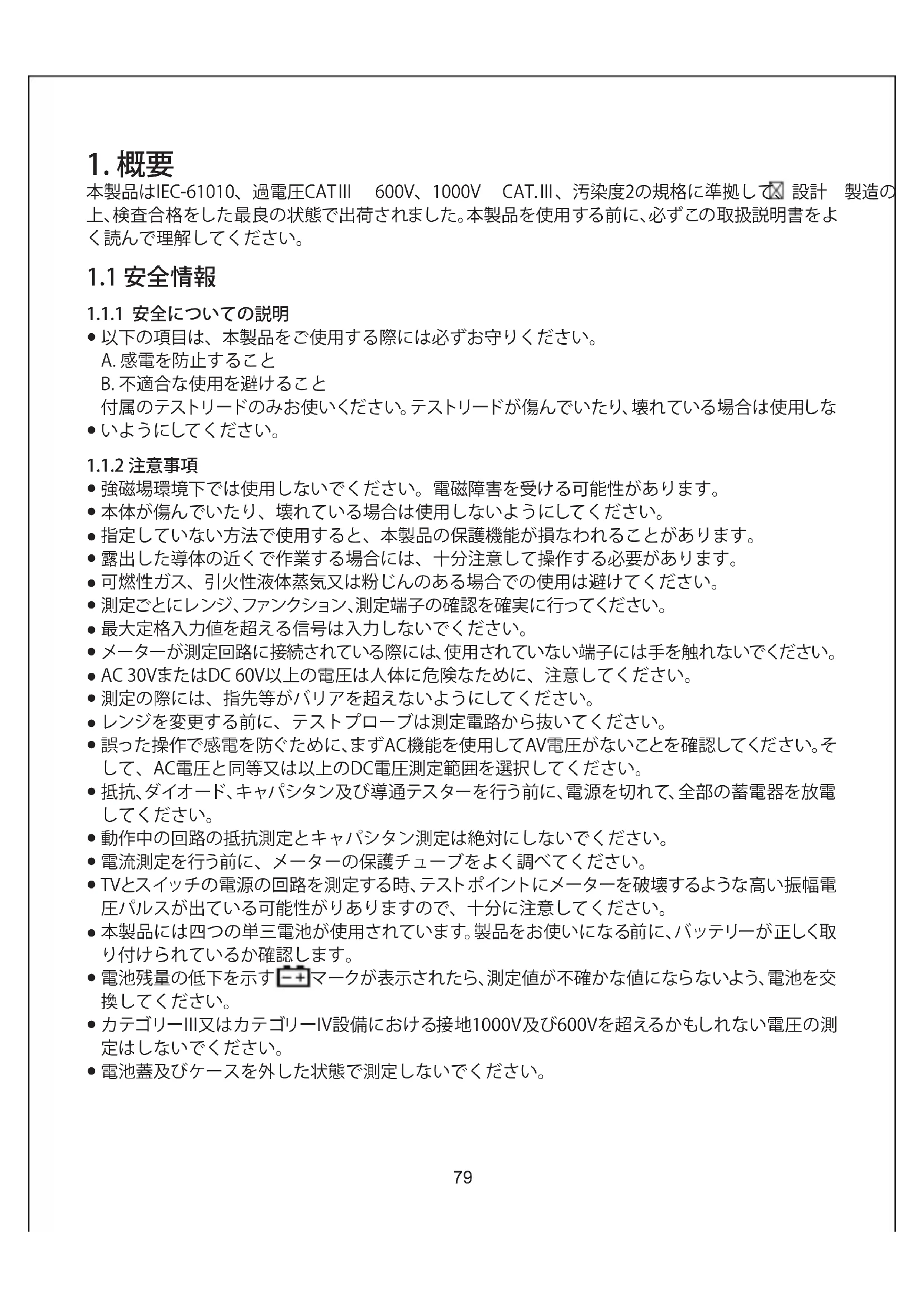 定はしないでください。 電池蓋及びケースを外した状態で測定しないでください。 1.概要