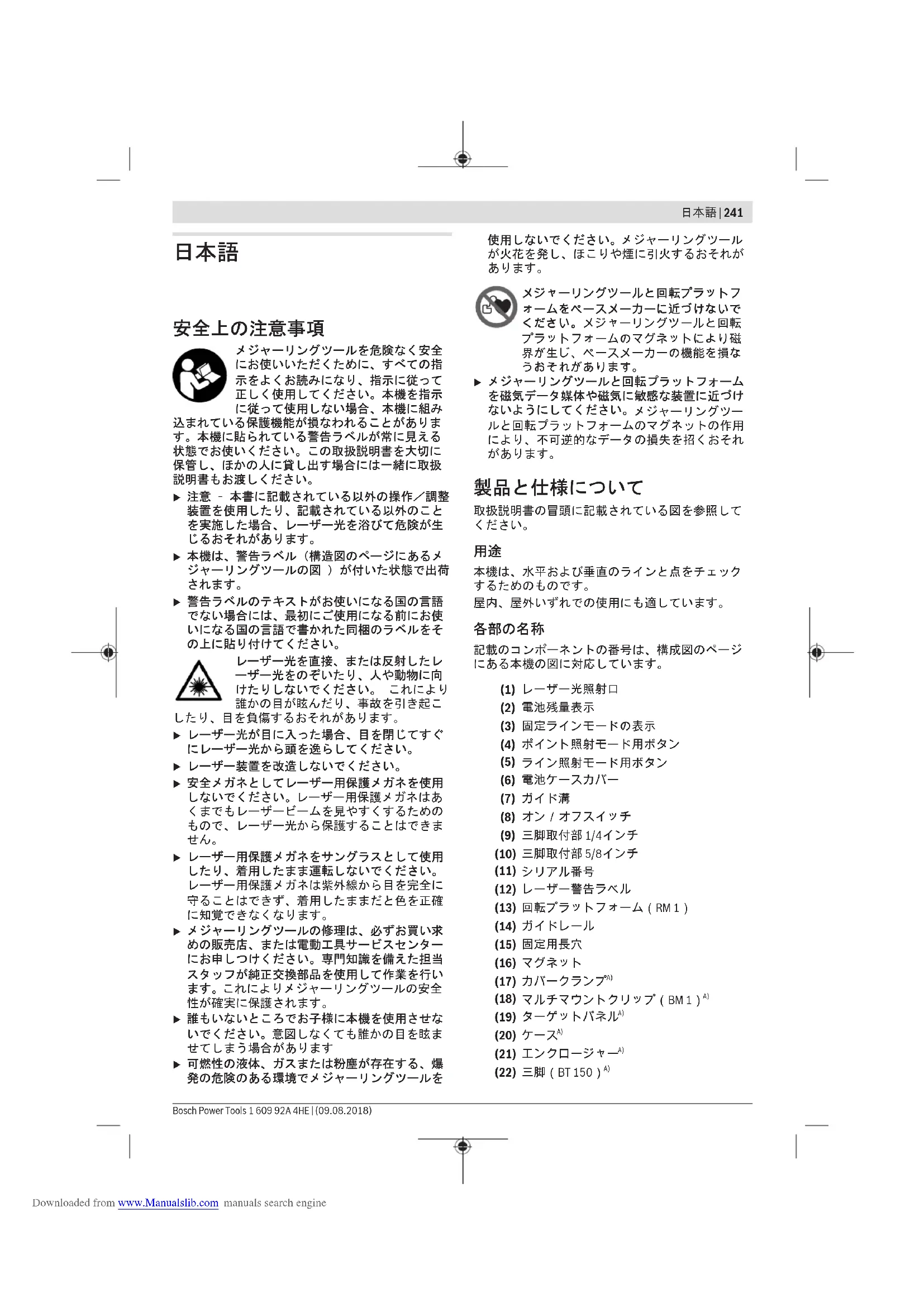 自動電源オフ機能の一時的解除 自動電源オフ機能を解除するには、(本機がオン になっている時に)ライン照射モード用ボタン (5) 日本語 | 243 Bosch Power Tools 1 609 92A 4HE | (09.08.2018) Downloaded from www.Manualslib.com manuals search engine244 | 日本語 1 609 92A 4HE | (09.08.2018) Bosch Power Tools を3秒以上押し続けます。自動電源オフ機能を解除 すると、確認のためにレーザー光が短く点滅しま