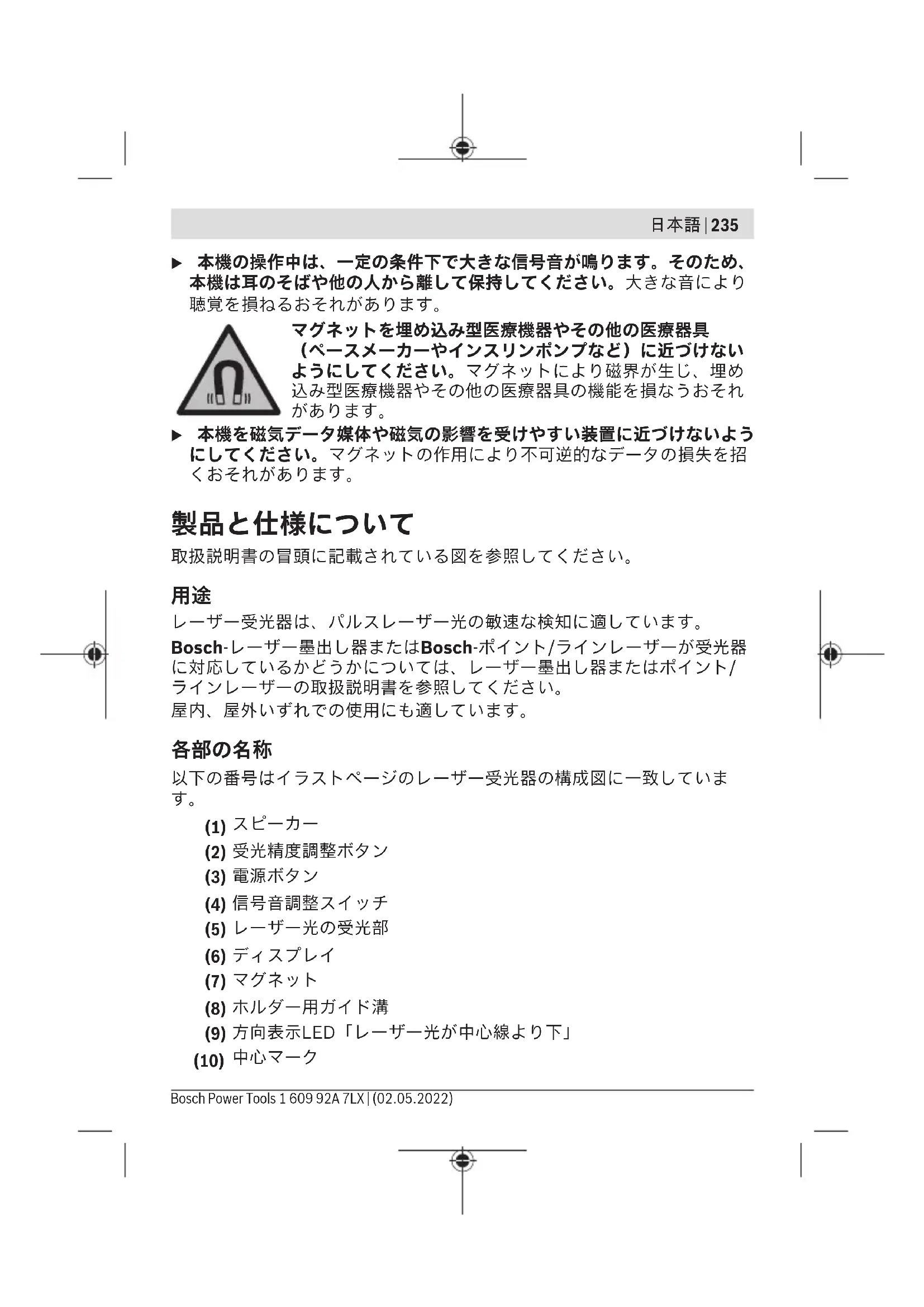 Bosch Power Tools 1 609 92A 7LX | (02.05.2022)238 | 日本語 u 長期間にわたってレーザー受光器をご使用にならない場合には、ここか ら電池を取り出しておいてください。電池を本機の中に長期間入れたま まにすると、電池の腐食や自然放電につながることがあります。