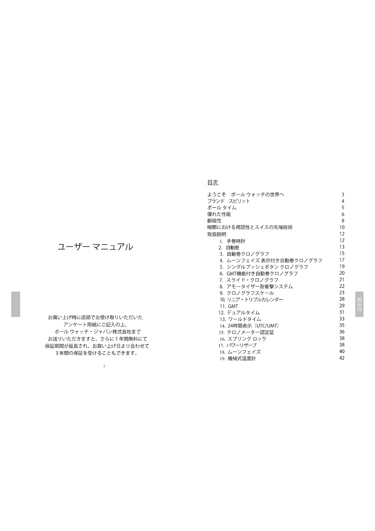 お買い上げ時に店頭でお受け取りいただいた アンケート用紙にご記入の上、 ボール ウォッチ・ジャパン株式会社まで お送りいただきますと、さらに1年間無料にて 保証期間が延長され、お買い上げ日より合わせて 3年間の保証を受けることもできます。 ようこそ ボール ウォッチの世界へ