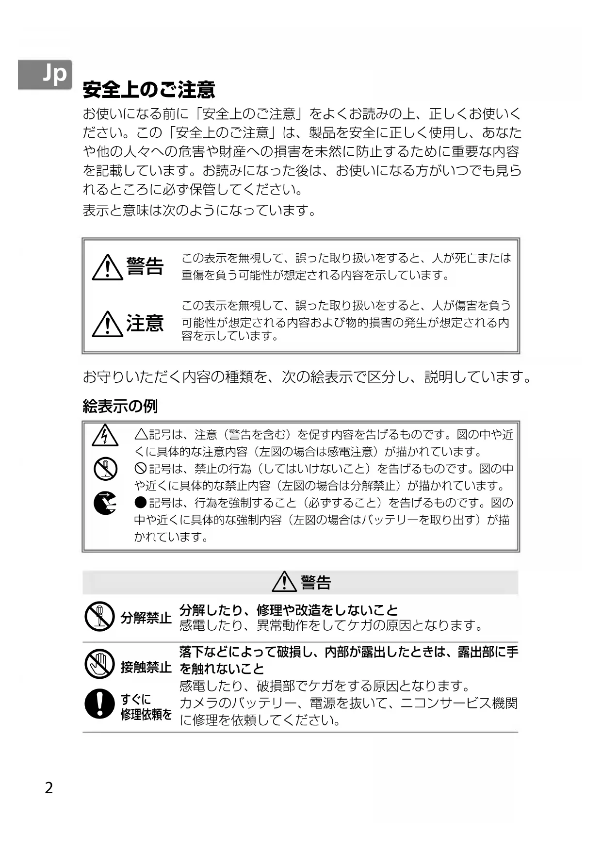修理依頼を熱くなる、煙が出る、こげ臭いなどの異常時は、すみやかにカメラのバッテリーを取り出すことそのまま使用すると火災、やけどの原因となります。バッテリーを取り出す際、やけどに充分注意してください。バッテリーを抜いて、ニコンサービス機関に修理を依頼してください。 水かけ禁止水につけたり、水をかけたり、雨にぬらしたりしないこと発火したり感電の原因となります。