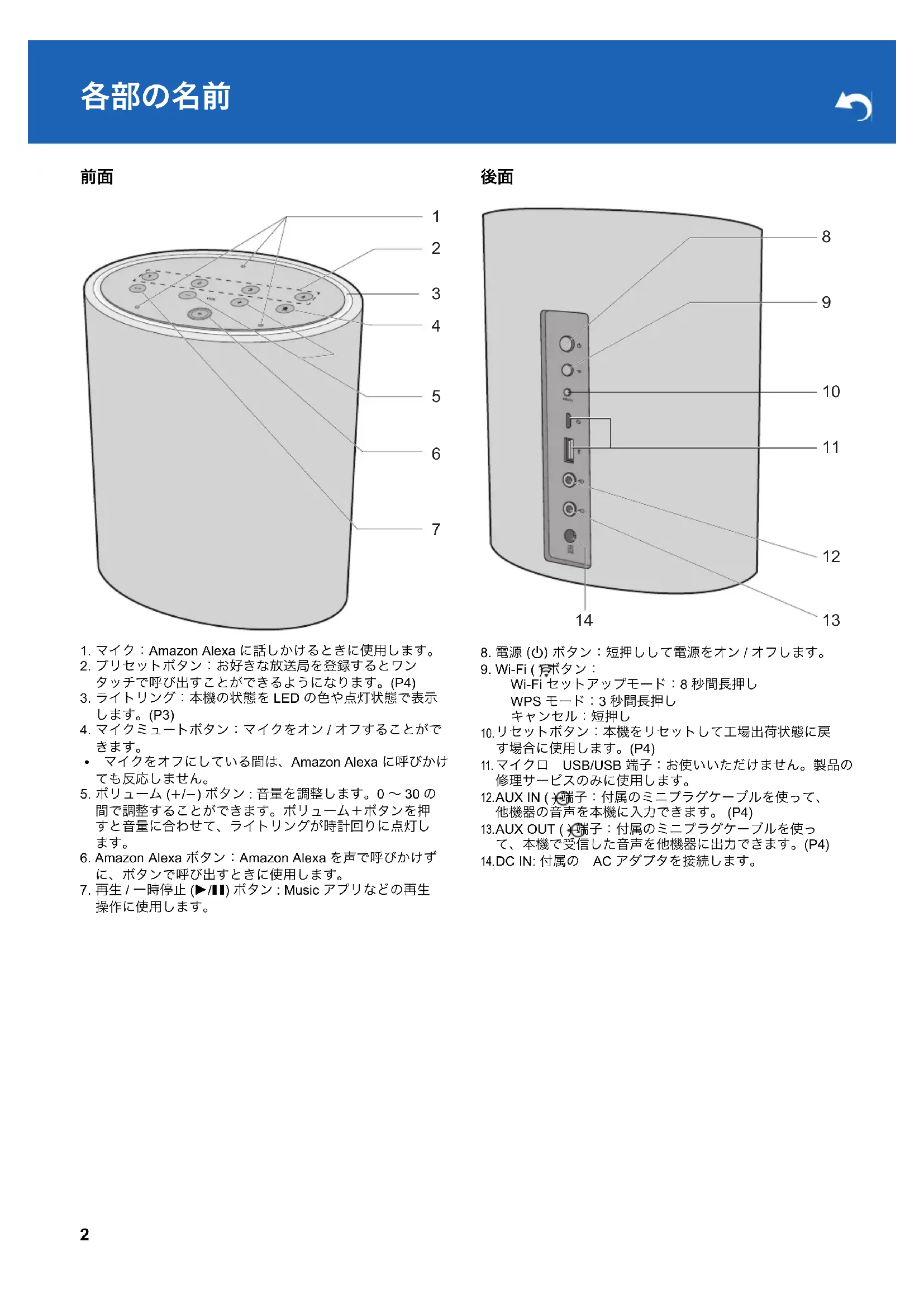 1. マイク:Amazon Alexa に話しかけるときに使用します。