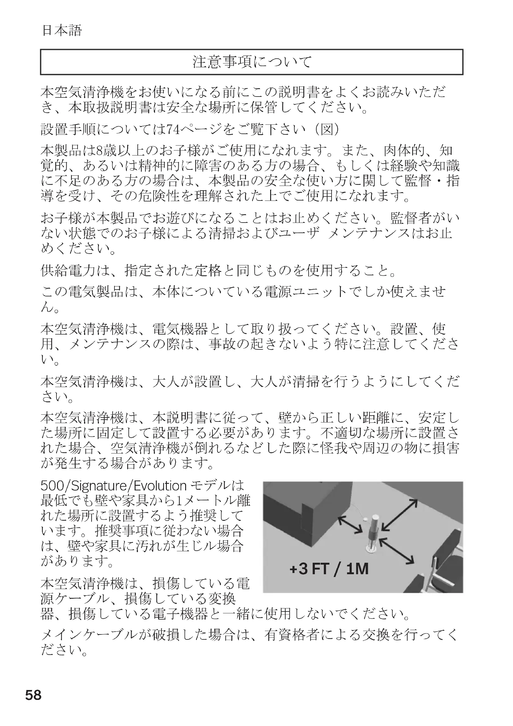 本空気清浄機は、本説明書に従って、壁から正しい距離に、安定し た場所に固定して設置する必要があります。不適切な場所に設置さ れた場合、空気清浄機が倒れるなどした際に怪我や周辺の物に損害 が発生する場合があります。 500/Signature/Evolution モデルは 最低でも壁や家具から1メートル離 れた場所に設置するよう推奨して います。推奨事項に従わない場合 は、壁や家具に汚れが生じル場合