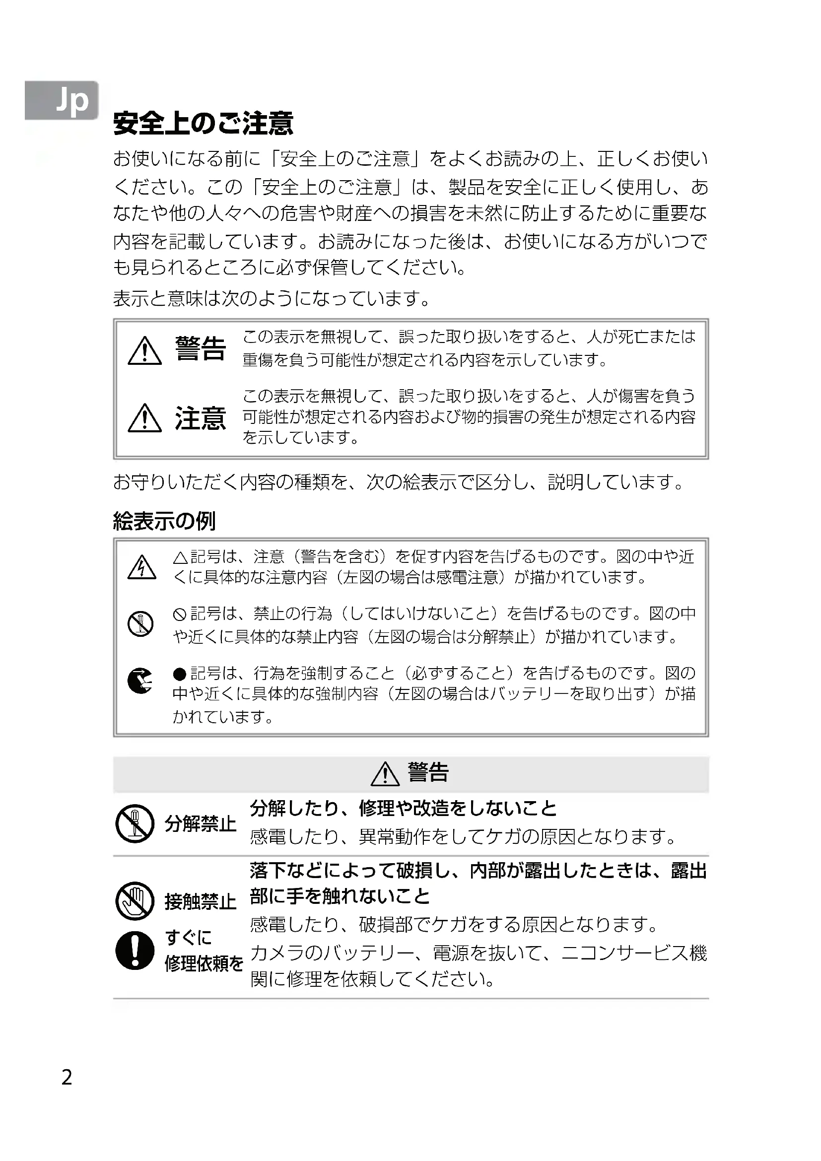 修理依頼を落下などによって破損し、内部が露出したときは、露出部に手を触れないこと感電したり、破損部でケガをする原因となります。カメラのバッテリー、電源を抜いて、ニコンサービス機関に修理を依頼してください。3