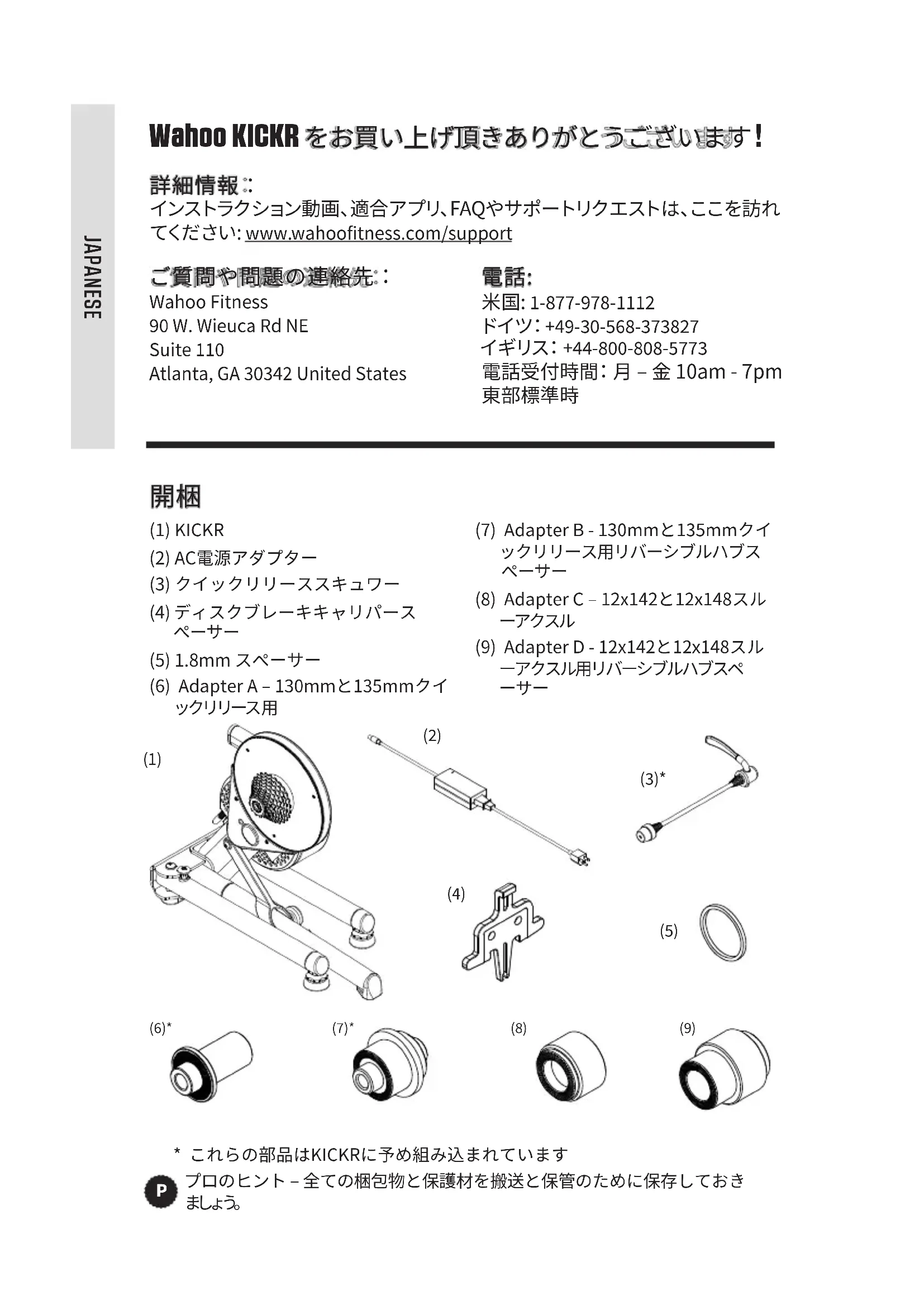 (1) KICKR(2) AC電源アダプター(3) クイックリリーススキュワー(4) ディスクブレーキキャリパース ペーサー (5) 1.8mm スペーサー (6) Adapter A – 130mmと135mmクイックリリース用 (7) Adapter B - 130mmと135mmクイックリリース用リバーシブルハブスペーサー (8) Adapter C – 12x142と12x148スルーアクスル (9) Adapter D - 12x142と12x148スルーアクスル用リバーシブルハブスペ (6)* (7)* (8) (9) JAPANESE36