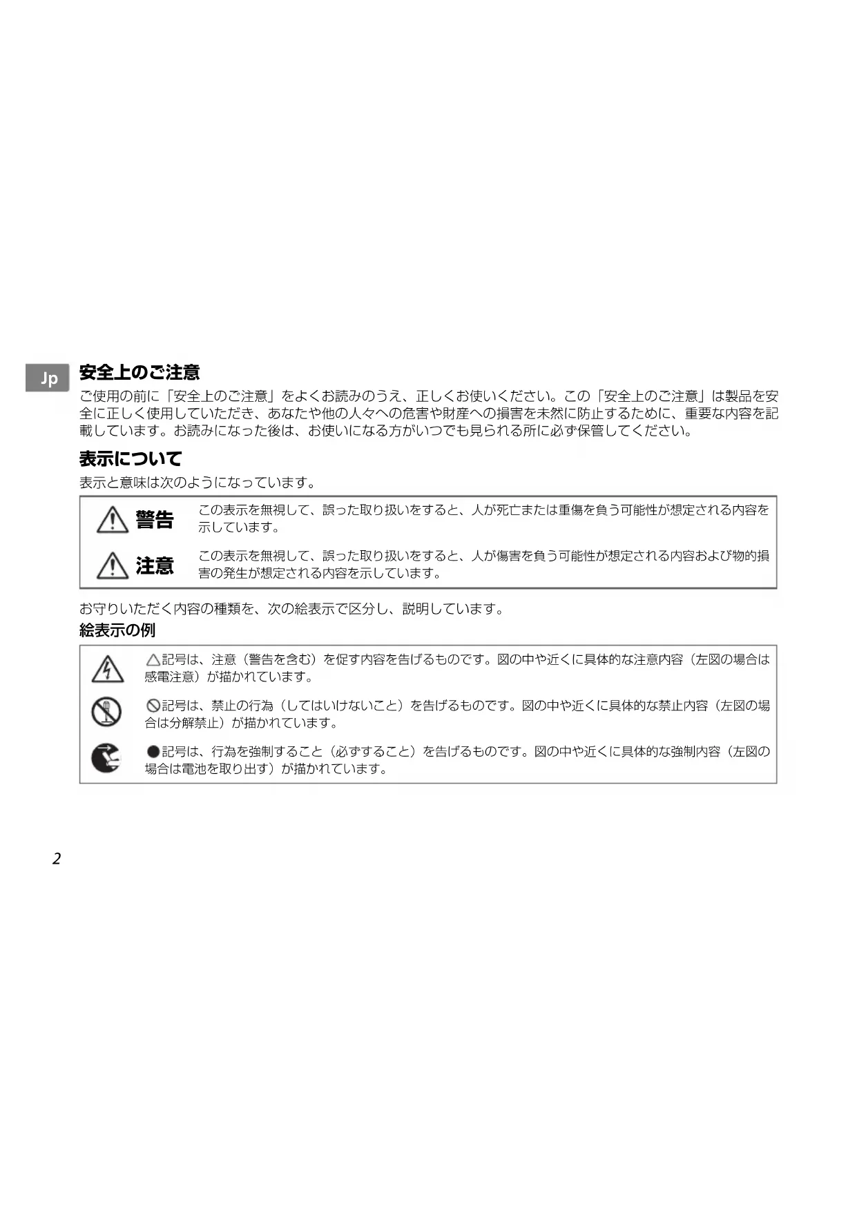 この表示を無視して、誤った取り扱いをすると、人が死亡または重傷を負う可能性が想定される内容を示しています。 この表示を無視して、誤った取り扱いをすると、人が傷害を負う可能性が想定される内容および物的損害の発生が想定される内容を示しています。記号は、注意(警告を含む)を促す内容を告げるものです。図の中や近くに具体的な注意内容(左図の場合は感電注意)が描かれています。記号は、禁止の行為(してはいけないこと)を告げるものです。図の中や近くに具体的な禁止内容(左図の場合は分解禁止)が描かれています。記号は、行為を強制すること(必ずすること)を告げるものです。図の中や近くに具体的な強制内容(左図の場合は電池を取り出す)が描かれています。3