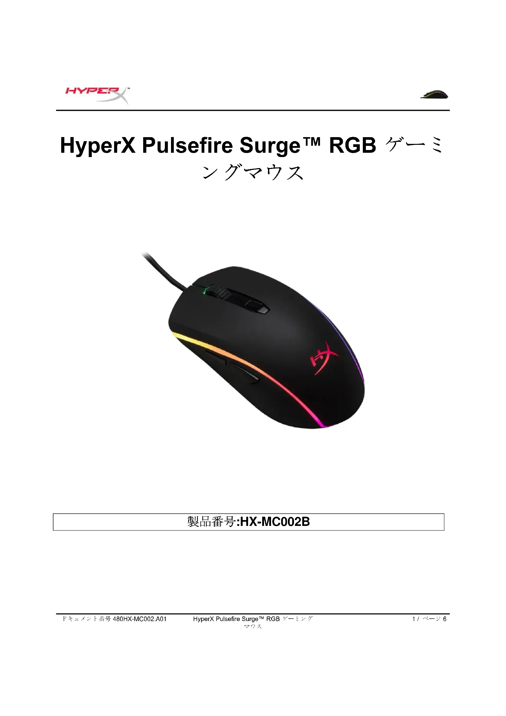 製品番号:HX-MC002Bドキュメント番号 480HX-MC002.A01 HyperX Pulsefire Surge™ RGB ゲーミング