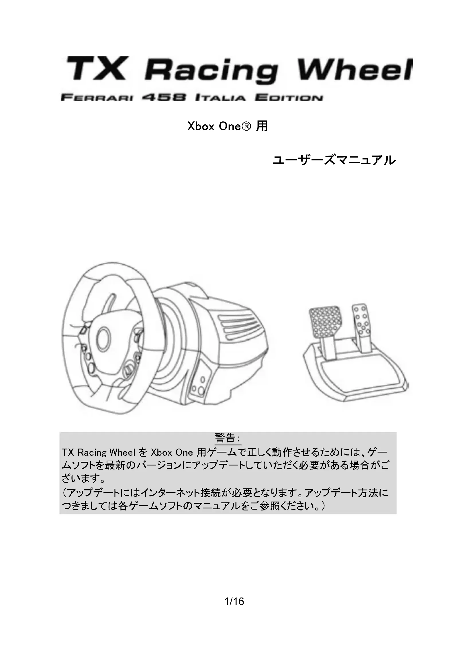 TX Racing Wheel を Xbox One 用ゲームで正しく動作させるためには、ゲー ムソフトを最新のバージョンにアップデートしていただく必要がある場合がご
