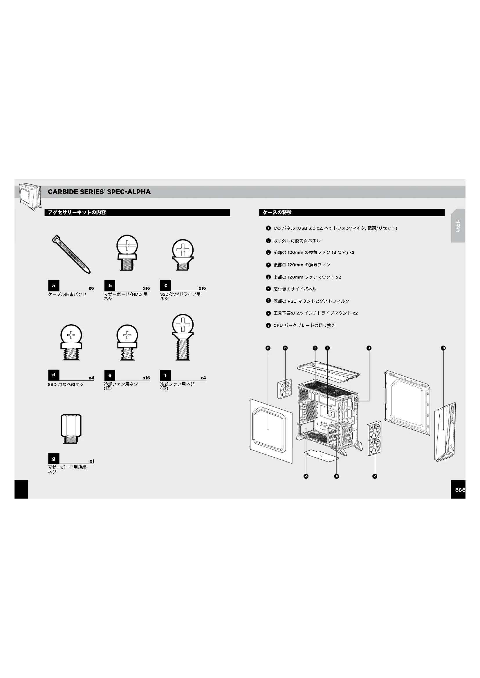 アクセサリーキットの内容 I/O パネル (USB 3.0 x2, ヘッドフォン/マイク, 電源/リセット) 取り外し可能前面パネル 前部の 120mm の換気ファン (3 つ分) x2 後部の 120mm の換気ファン 上部の 120mm ファンマウント x2