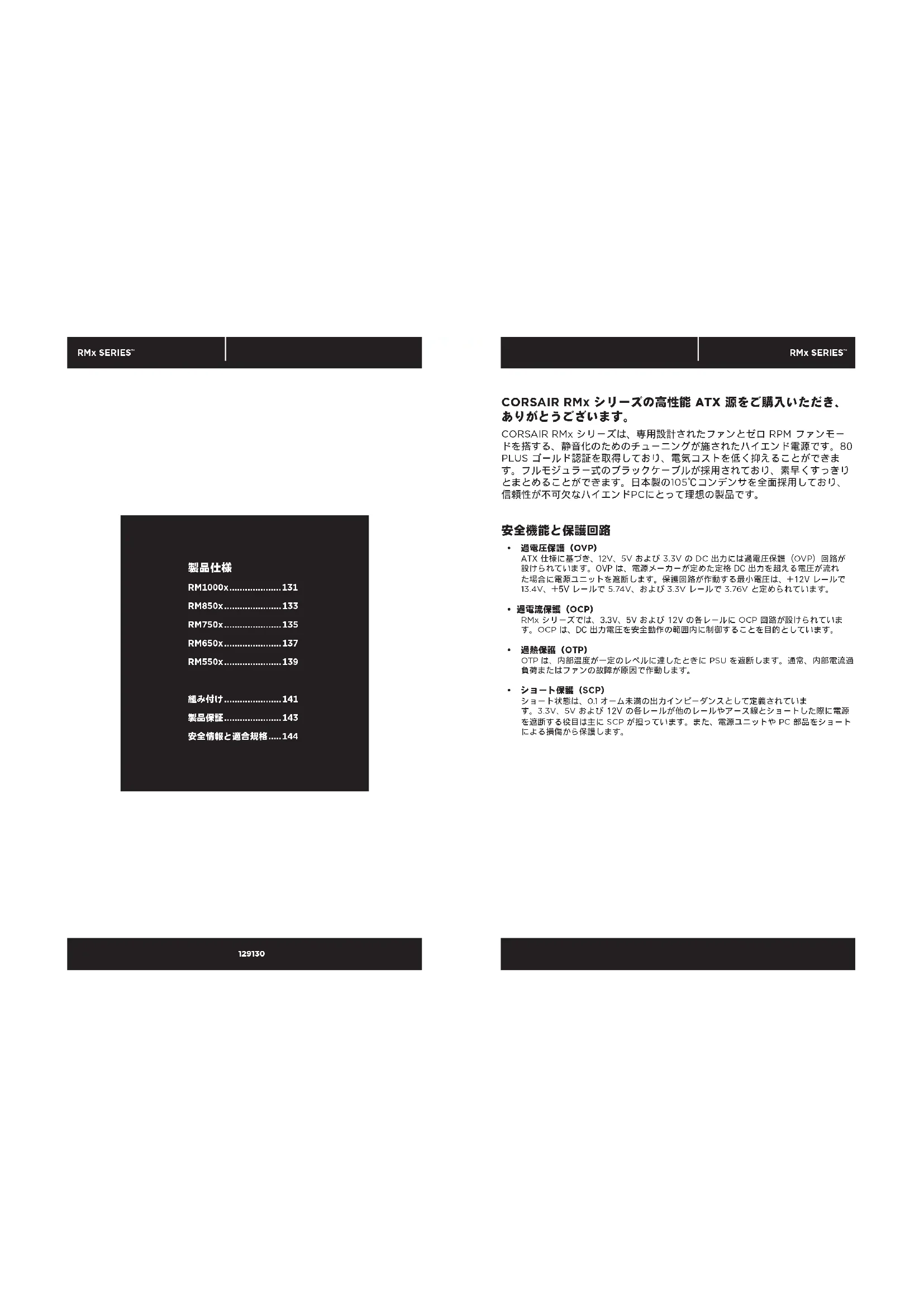CORSAIR RMx シリーズの高性能 ATX 源をご購入いただき、 ありがとうございます。 CORSAIR RMx シリーズは、専用設計されたファンとゼロ RPM ファンモー ドを搭する、静音化のためのチューニングが施されたハイエンド電源です。80 PLUS ゴールド認証を取得しており、電気コストを低く抑えることができま す。フルモジュラー式のブラックケーブルが採用されており、素早くすっきり とまとめることができます。日本製の105℃コンデンサを全面採用しており、 信頼性が不可欠なハイエンドPCにとって理想の製品です。