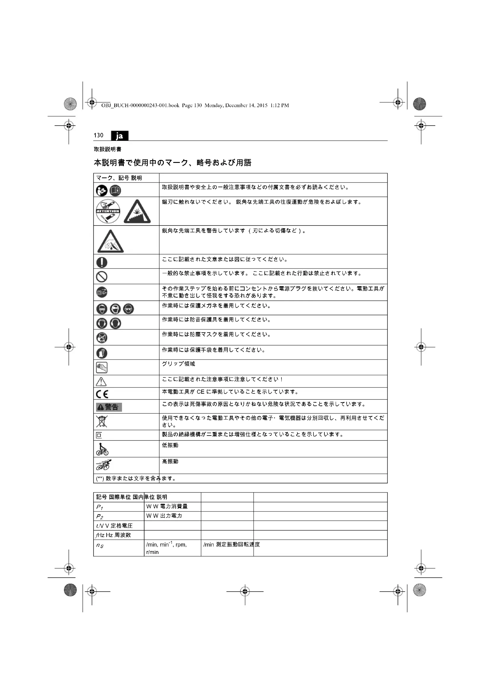 EN 60745 準拠振動加速度 (3 方向のベクトル和)m, s, kg, A, mm, V, W, Hz, N, °C, dB, min, m/s m, s, kg, A, mm, V, W, Hz, N, C, dB, min, m/s 国際単位系 (SI)で使用されている基本単位および組立単位。記号 国際単位 国内単位 説明OBJ_BUCH-0000000243-001.book Page 131 Monday, December 14, 2015 1:12 PM132
