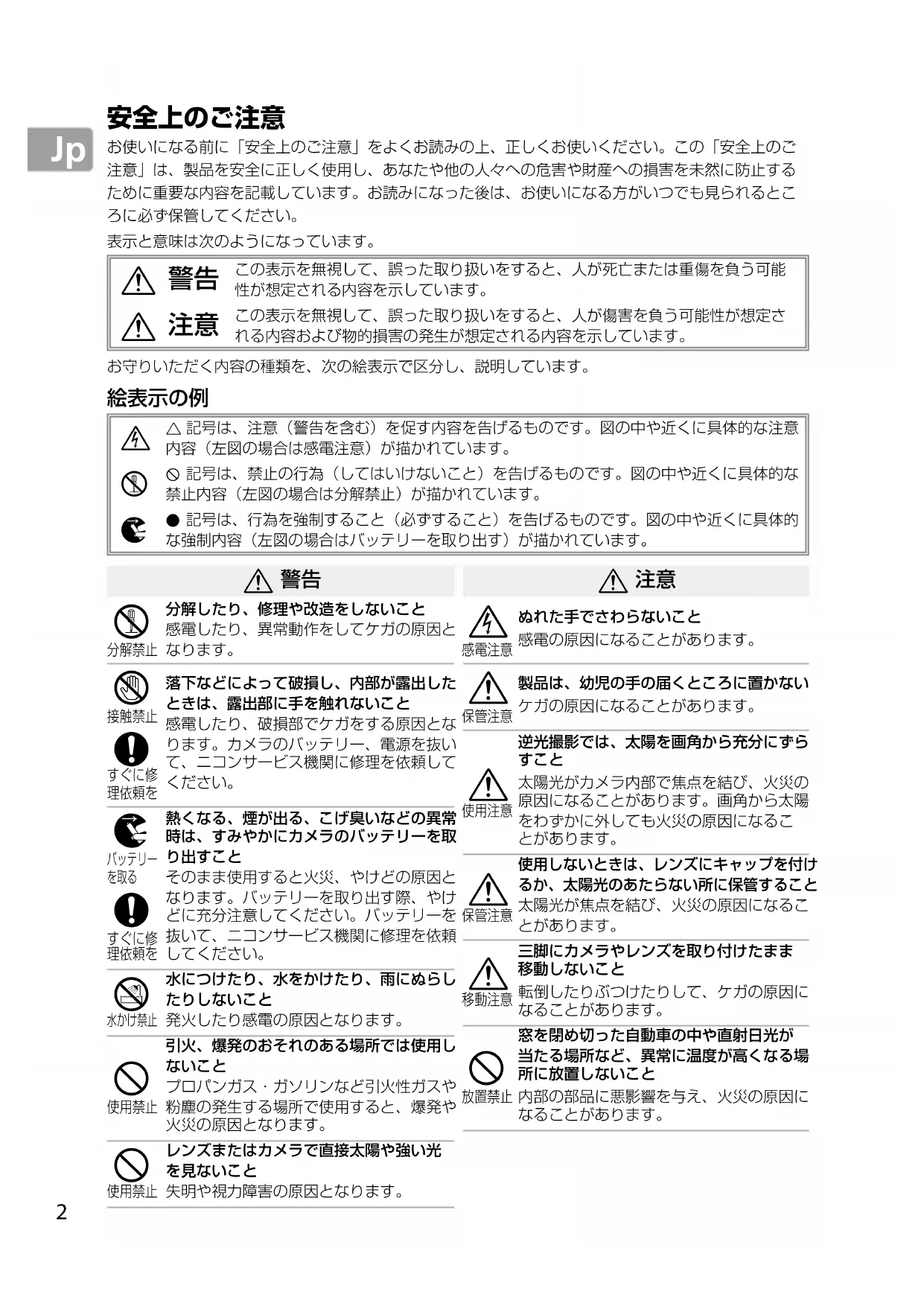 熱くなる、煙が出る、こげ臭いなどの異常時は、すみやかにカメラのバッテリーを取り出すことそのまま使用すると火災、やけどの原因となります。バッテリーを取り出す際、やけどに充分注意してください。バッテリーを抜いて、ニコンサービス機関に修理を依頼してください。
