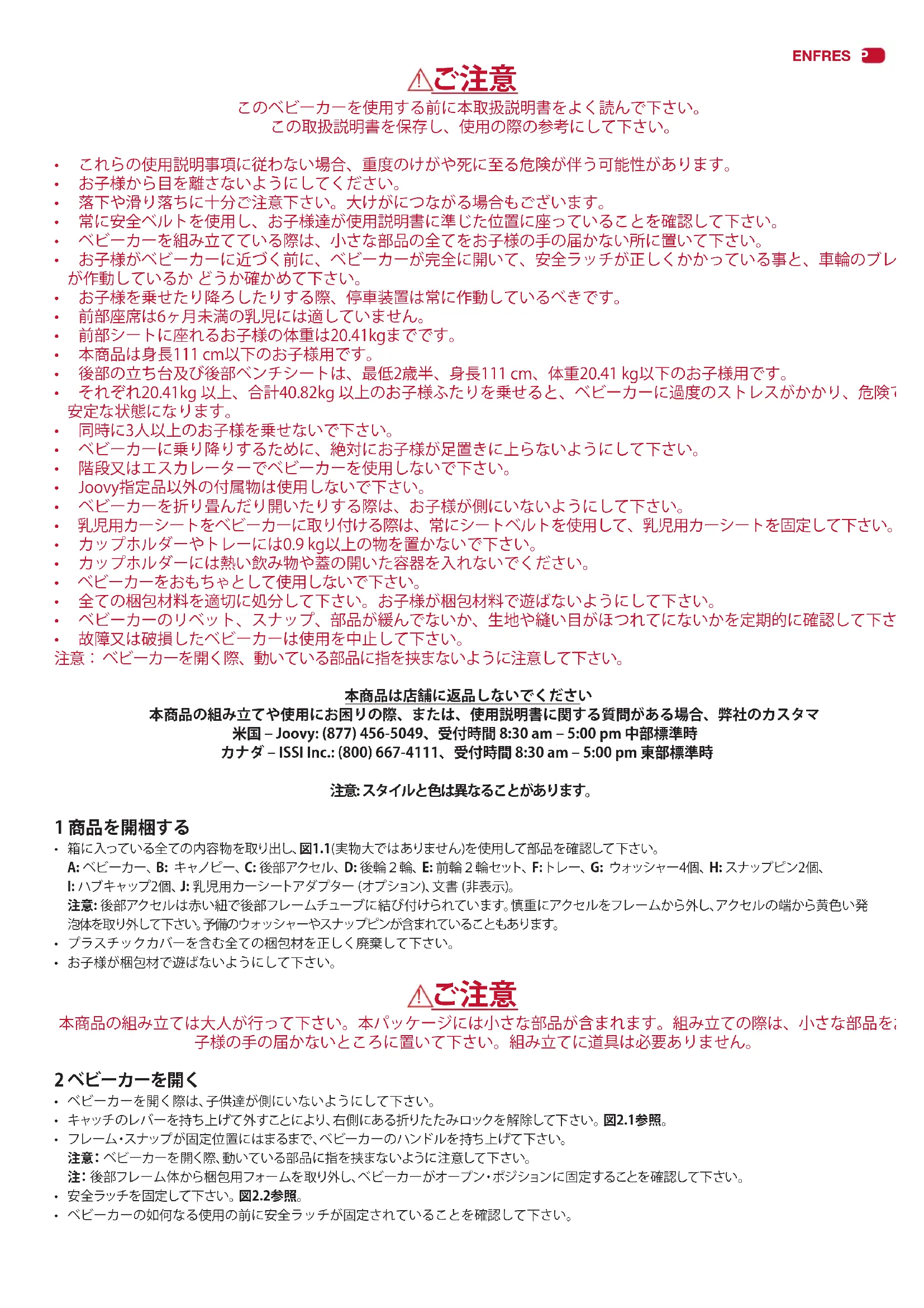 - 故障又は破損したベビーカーは使用を中止して下さい。 注意:ベビーカーを開く際、動いている部品に指を挟まないように注意して下さい。 本商品は店舗に返品しないでください 本商品の組み立てや使用にお困りの際、または、使用説明書に関する質問がある場合、弊社のカスタマ 米国 – Joovy: (877) 456-5049、受付時間 8:30 am – 5:00 pm 中部標準時 カナダ – ISSI Inc.: (800) 667-4111、受付時間 8:30 am – 5:00 pm 東部標準時 注意: スタイルと色は異なることがあります。 1 商品を開梱する