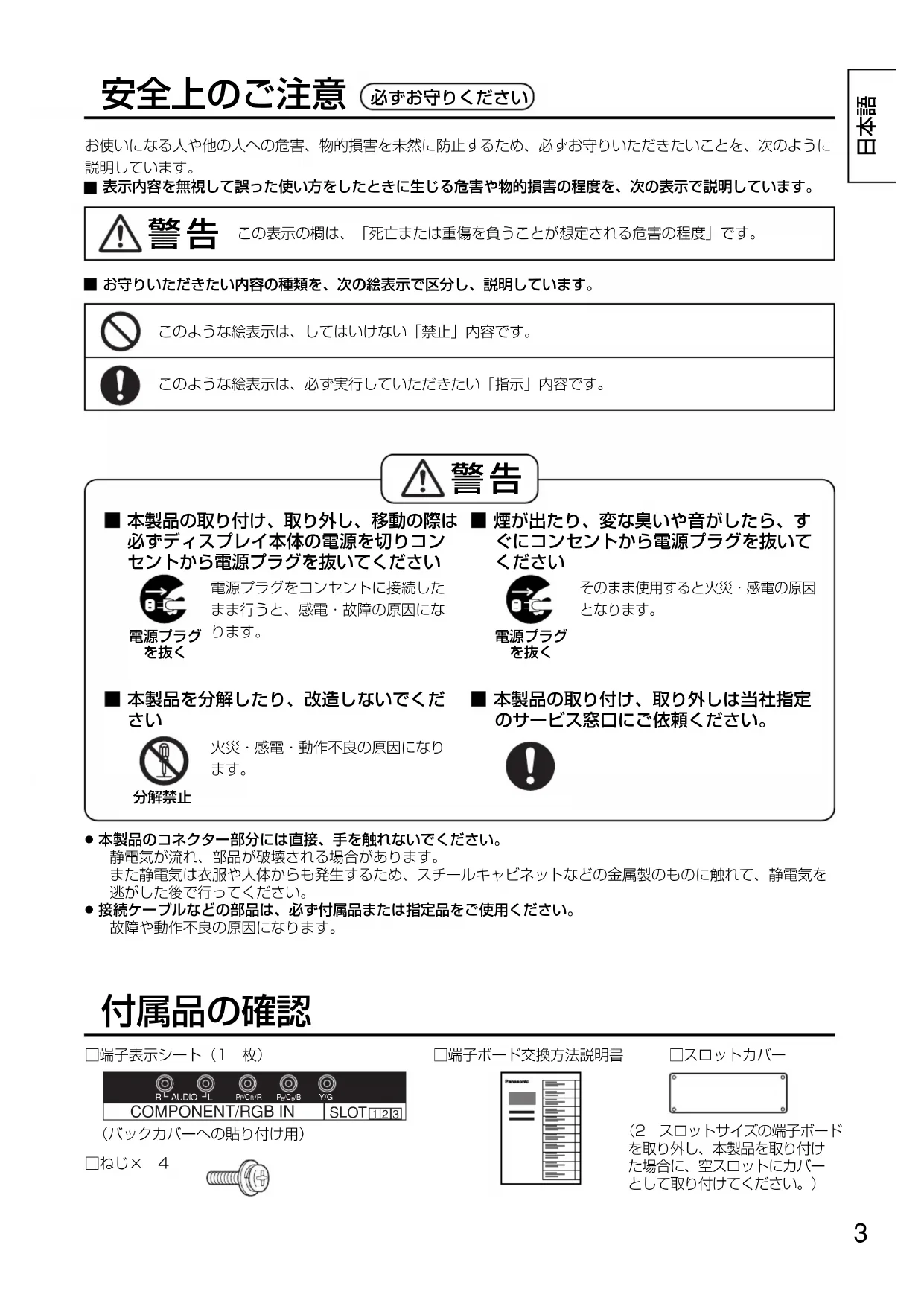 松下電器産業株式会社 映像・ディスプレイデバイス事業グループ 〒 571-8504 大阪府門真市松生町 1 番 15 号 (06)6905 − 5574 © 2005 Matsushita Electric Industrial Co.,Ltd.(松下電器産業株式会社) All Rights Reserved. ご相談窓口における個人情報のお取り扱い 松下電器産業株式会社およびその関係会社は、お客様の個人情報やご相談内容を、ご相談への対応や修理、その 確認などのために利用し、その記録を残すことがあります。また、個人情報を適切に管理し、修理業務等を委託 する場合や正当な理由がある場合を除き、第三者に提供しません。お問い合わせは、ご相談された窓口にご連絡 ください。6 Safety Precautions ( be sure to observe ) Terminal function label ( 1 sheet ) Accessories Check to make sure that the following accessories are included in the Terminal board package: Terminal board replacementInstructions Slot cover(Affix this label to the applicable slot of the rear panelof the display.) English Screw × 4(To install this Terminal Board, remove an existingdual size Terminal Board and fit it into the nowblank slot.)