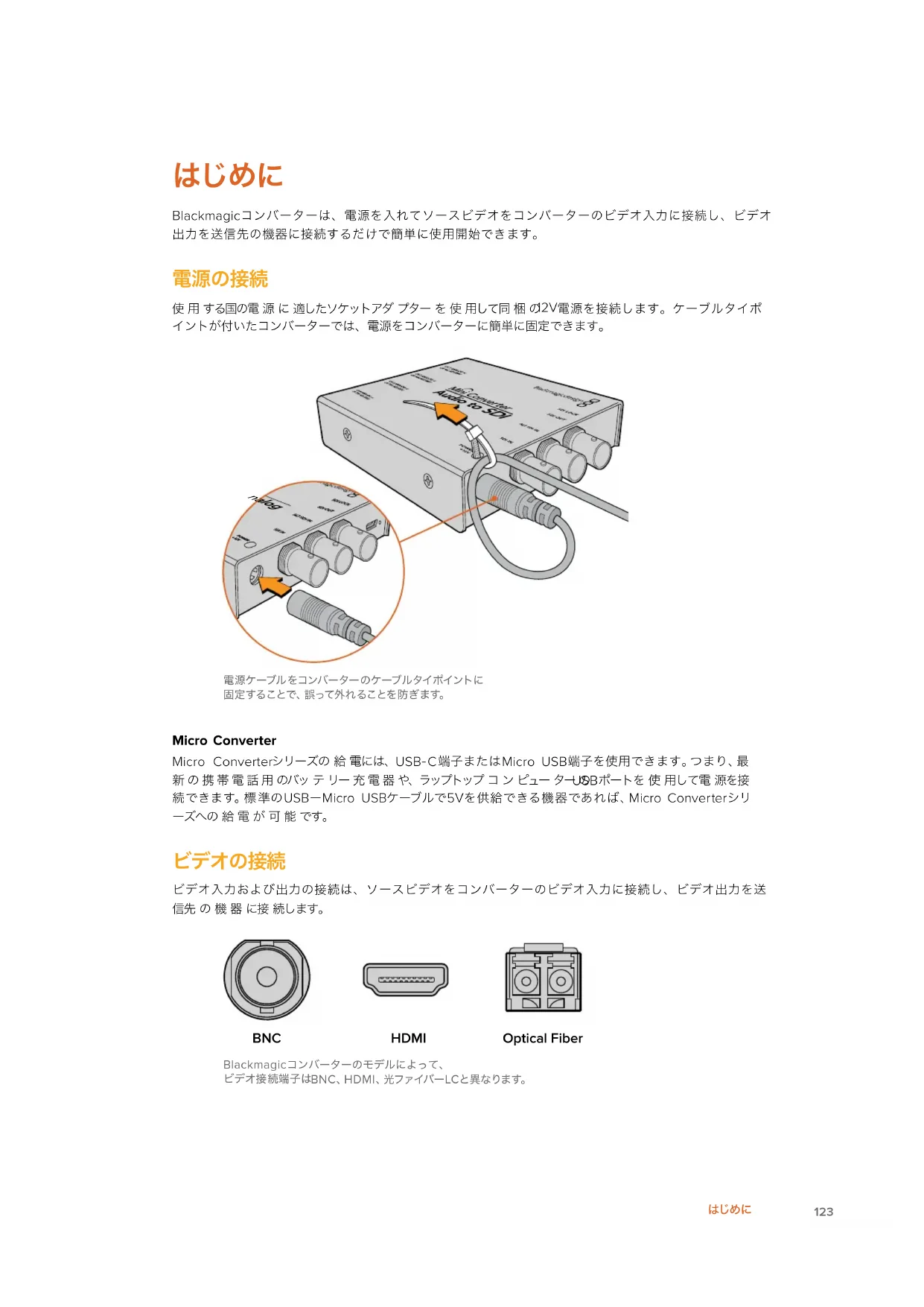 Micro USB 端 子 を 使 用 で き ま す 。つ ま り 、最新 の 携 帯 電 話 用 のバッ テ リー 充 電 器 や、ラップトップ コ ン ピュー ター の USB ポートを 使 用して電 源を接 続 で き ま す 。標 準 の USBーMicro USBケーブルで 5Vを供給できる機 器であれば、Micro Converterシリ ーズへの 給 電 が 可 能 です。 ビデオ入力および出力の接続は、ソースビデオをコンバーターのビデオ入力に接続し、ビデオ出力を送信先 の 機 器 に接 続します。 BNC HDMI Optical Fiber Blackmagicコンバーターのモデルによって、
