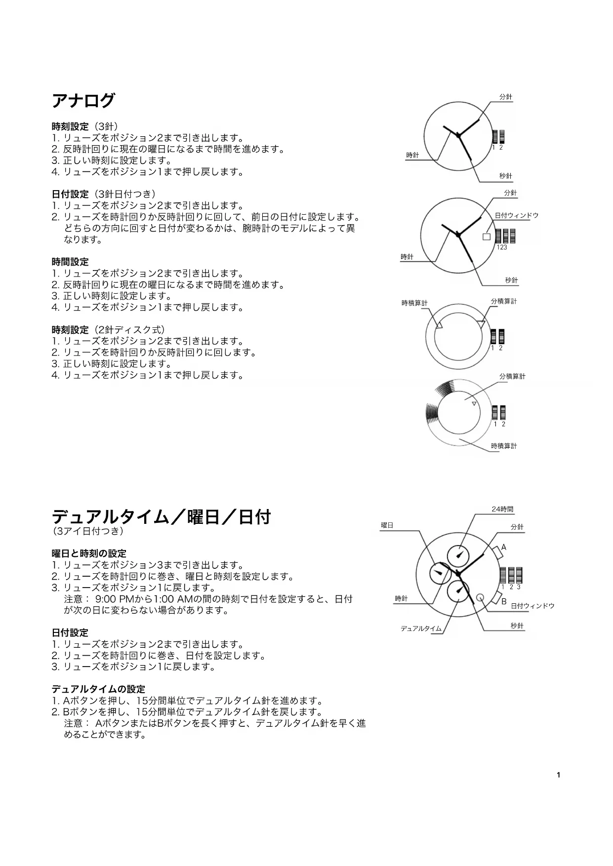 6.リューズをポジション1に戻します。 注意:クラウンが2の位置にある時には、プッシャーを押さないでくだ さい。プッシャーを押すと、ストップウォッチ針が動いてしまいます。