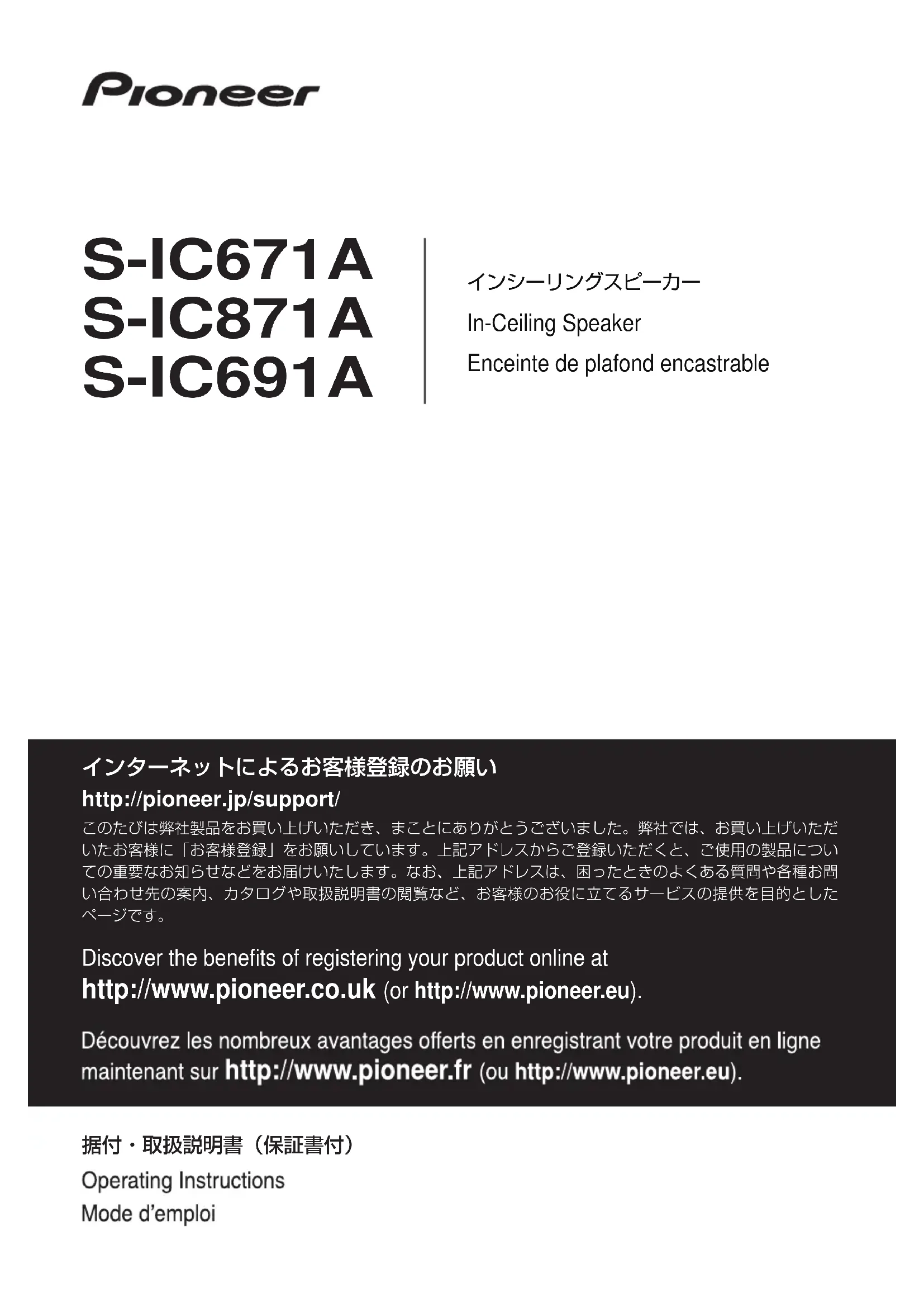 インシーリングスピーカー In-Ceiling Speaker Enceinte de plafond encastrable Discover the benefits of registering your product online at http://www.pioneer.co.uk (or http://www.pioneer.eu). S-IC671A S-IC871A S-IC691A 据付・取扱説明書(保証書付) http://pioneer.jp/support/ このたびは弊社製品をお買い上げいただき、まことにありがとうございました。弊社では、お買い上げいただいたお客様に「お客様登録」をお願いしています。上記アドレスからご登録いただくと、ご使用の製品についての重要なお知らせなどをお届けいたします。なお、上記アドレスは、困ったときのよくある質問や各種お問い合わせ先の案内、カタログや取扱説明書の閲覧など、お客様のお役に立てるサービスの提供を目的としたページです。 インターネットによるお客様登録のお願い cover_front.fm 1 ページ 2009年11月9日 月曜日 午後1時54分2