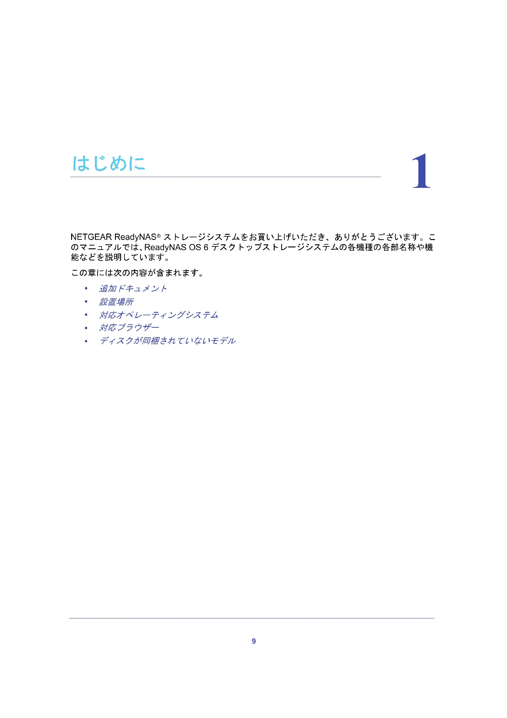 ストレージシステムをお買い上げいただき、ありがとうございます。こ のマニュアルでは、ReadyNAS OS 6 デスクトップストレージシステムの各機種の各部名称や機 能などを説明しています。 この章には次の内容が含まれます。
