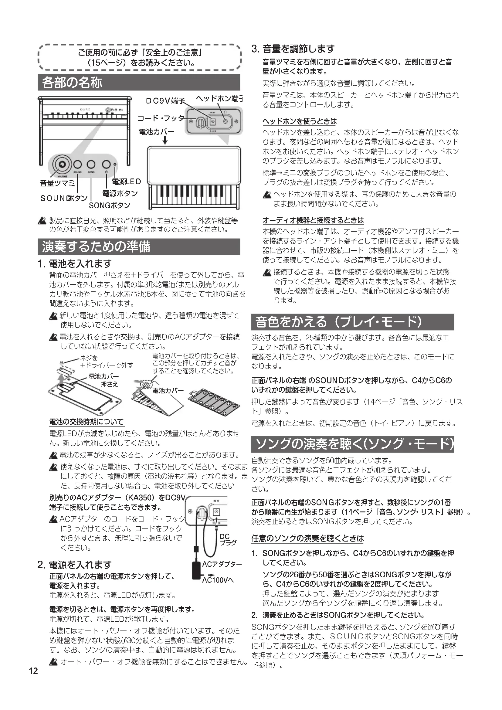 記号は、注意(危険、警告を含む)を示しています。記号の中には、具体的な注意内容が描かれています。左の図は「一般的な注意、警告、危険」を表しています。記号は、禁止(してはいけないこと)を示しています。記号の中には、具体的な注意内容が描かれることがあります。左の図は「分解禁止」を表しています。記号は、強制(必ず行うこと)を示しています。記号の中には、具体的な注意内容が描かれることがあります。左の図は「電源プラグをコンセントから抜くこと」を表しています。以下の指示を守ってください この注意事項を無視した取り扱いをすると、死亡や重傷を負う可能性があります。 ACアダプターのプラグは、必ずAC100Vの電源コンセントに差し込む。 ACアダプターのプラグにほこりが付着している場合は、ほこりを拭き取る。感電やショートの恐れがあります。・ 本製品はコンセントの近くに設置し、ACアダプターのプラグへ容易に手が届くようにする。・ 次のような場合には、直ちに電源を切ってACアダプターのプラグをコンセントから抜く。○ACアダプターが破損したとき ○異物が内部に入ったとき○製品に異常や故障が生じたとき修理が必要なときは、コルグお客様相談窓口へ依頼してください。・ 本製品を分解したり改造したりしない。・ 修理、部品の交換などで、取扱説明書に書かれている以外のことは絶対に ・ ACアダプターのコードを無理に曲げたり、発熱する機器に近づけない。また、ACアダプターのコードの上に重いものをのせない。コードが破損し、感電や火災の原因になります。・ 大音量や不快な程度の音量で長時間使用しない。大音量で長時間使用すると、難聴になる可能性があります。万一、聴力低下や耳鳴りを感じたら、専門の医師に相談してください。 本製品に異物(燃えやすいもの、硬貨、針金など)を入れない。・ 温度が極端に高い場所(直射日光の当たる場所、暖房機器の近く、発熱する機器の上など)で使用や保管はしない。・ 振動の多い場所で使用や保管はしない。・ ホコリの多い場所で使用や保管はしない。・ 風呂場、シャワー室で使用や保管はしない。・ 雨天時の野外のように、湿気の多い場所や水滴のかかる場所で、使用や保管はしない。・ 本製品に液体をこぼさない。・ 濡れた手で本製品を使用しない。 この注意事項を無視した取り扱いをすると、傷害を負う可能性または物理的損害が発生する可能性があります。・ 正常な通気が妨げられない所に設置して使用する。・ ラジオ、テレビ、電子機器などから十分に離して使用する。ラジオやテレビ等に接近して使用すると、本製品が雑音を受けて誤動作する場合があります。また、ラジオ、テレビ等に雑音が入ることがあります。本製品をテレビ等の横に設置すると、本製品の磁場によってテレビ等の故障の原因になることがあります。・ 外装のお手入れは、乾いた柔らかい布を使って軽く拭く。 ACアダプターをコンセントから抜き差しするときは、必ずプラグを持つ。・ 長時間使用しないときは、電池の液漏れを防ぐために電池を抜く。・ 電池は幼児の手の届かないところへ保管する。・ 長時間使用しないときは、ACアダプターをコンセントから抜く。・ 付属のACアダプターは、他の電気機器で使用しない。付属のACアダプターは本製品専用です。他の機器では使用できません。・ 他の電気機器の電源コードと一緒にタコ足配線をしない。・ 電池を過度の熱源(日光、火など)にさらさない。・ スイッチやツマミなどに必要以上の力を加えない。故障の原因になります。・ 本製品の定格消費電力に合ったコンセントに接続してください。・ 外装のお手入れに、ベンジンやシンナー系の液体、コンパウンド質、強燃性のポリッシャーは使用しない。・ 不安定な場所に置かない。本製品が落下してお客様がけがをしたり、本製品が破損する恐れがあります。・ 本製品の上に乗ったり、重いものをのせたりしない。本製品が落下または損傷してお客様がけがをしたり、本製品が破損する恐れがあります。*すべての製品名および会社名は、各社の商標または登録商標です。 演奏を楽しむためのエチケット 音楽を楽しむときには、周囲への音の配慮も大切です。演奏する時間によって、音量調節をしたり、ヘッドホンを使用しましょう。また、ヘッドホン使用時、または小さな音量での演奏時に、鍵盤の機構上若干のメカニズム音が聞こえます。あらかじめご了承ください。 本体のお手入れ方法について
