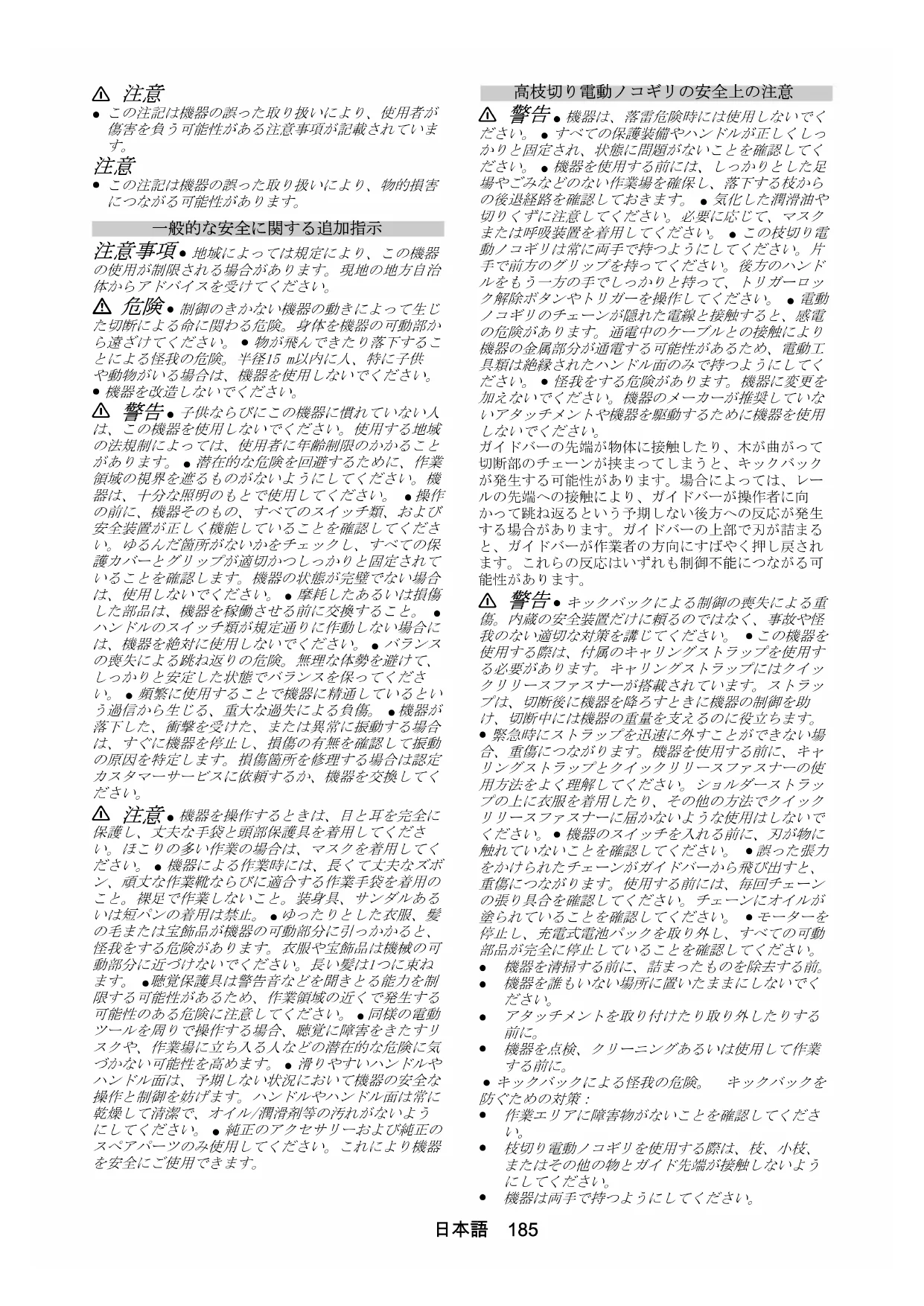 店では、聴覚保護具とバイザーを含めた一体型の保護用ヘルメットを入手できます。 この機器を用いた作業では、EN 381-7に準拠し、CEマークが付いた適切な切断保護手袋を着用してくださ 一般的な警告標識使用を開始する前に取扱説明書とすべての安全に関する注意事項をお読みく 機器での作業中には適切な視覚および聴覚保護具を着用すること。機器を用いて作業する際には、滑り止め機能があり、同時に耐久性のある手袋を着用してください。この機器を用いた作業では、滑り止めの付いた安全靴を着用してください。電気関連の危険。この機器を使用する際は、架空送電線までの距離を10 m以上保ってください。 飛散物体による危険。第三者、特に子供およびペットを作業範囲から少なくとも 15 m 以内に立ち入らせないでくだ ガイドバーとチェーンの潤滑チェーンの回転方向 10m188 日本語