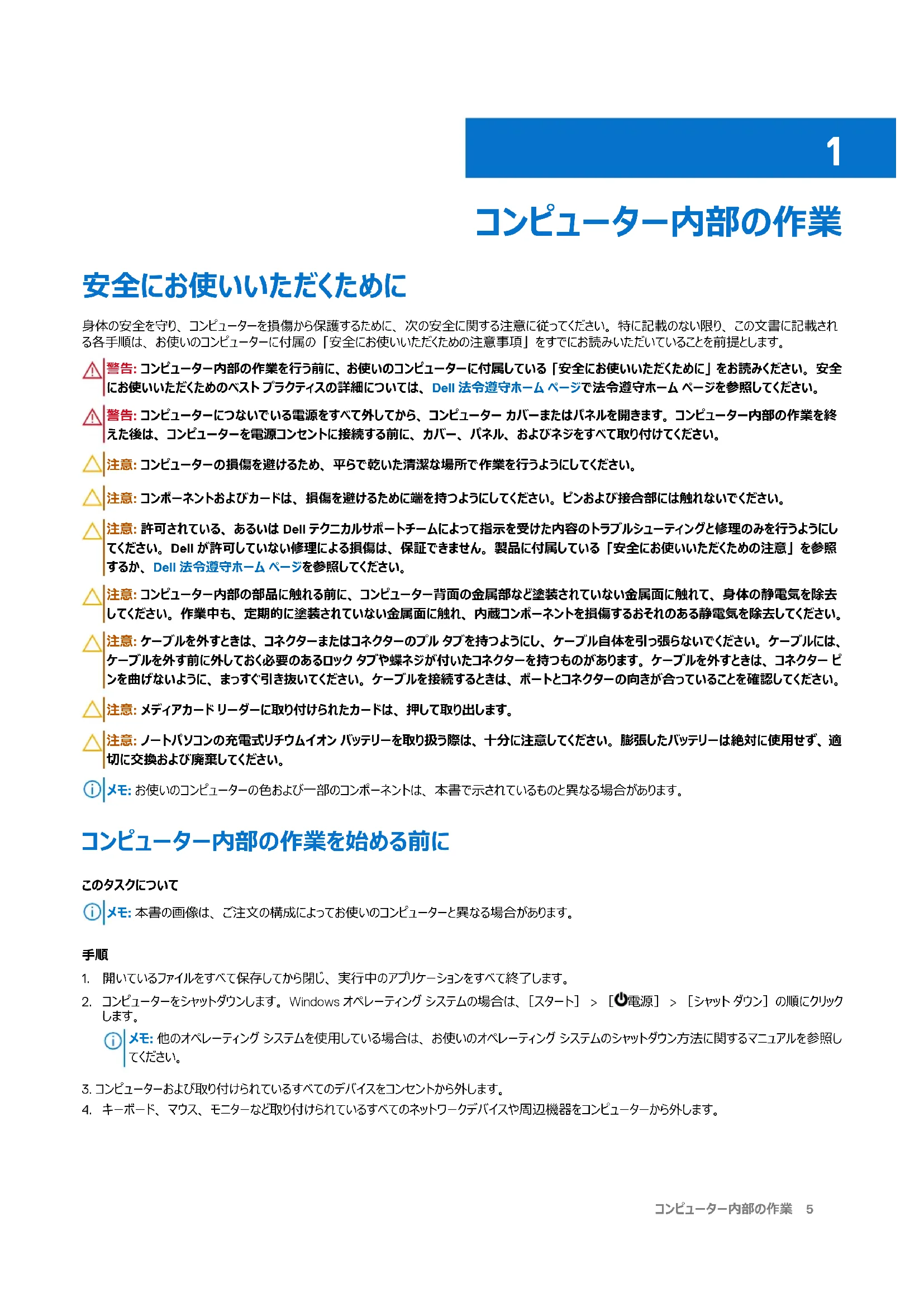 - 章 7: 「困ったときは」と「Dell へのお問い合わせ」 4 目次コンピューター内部の作業 安全にお使いいただくために 身体の安全を守り、コンピューターを損傷から保護するために、次の安全に関する注意に従ってください。特に記載のない限り、この文書に記載され る各手順は、お使いのコンピューターに付属の「安全にお使いいただくための注意事項」をすでにお読みいただいていることを前提とします。 警告: コンピューター内部の作業を行う前に、お使いのコンピューターに付属している「安全にお使いいただくために」をお読みください。安全 にお使いいただくためのベスト プラクティスの詳細については、Dell 法令遵守ホーム ページで法令遵守ホーム ページを参照してください。 警告: コンピューターにつないでいる電源をすべて外してから、コンピューター カバーまたはパネルを開きます。コンピューター内部の作業を終 えた後は、コンピューターを電源コンセントに接続する前に、カバー、パネル、およびネジをすべて取り付けてください。 注意: コンピューターの損傷を避けるため、平らで乾いた清潔な場所で作業を行うようにしてください。 注意: コンポーネントおよびカードは、損傷を避けるために端を持つようにしてください。ピンおよび接合部には触れないでください。 注意: 許可されている、あるいは Dell テクニカルサポートチームによって指示を受けた内容のトラブルシューティングと修理のみを行うようにし てください。Dell が許可していない修理による損傷は、保証できません。製品に付属している「安全にお使いいただくための注意」を参照 するか、Dell 法令遵守ホーム ページを参照してください。 注意: コンピューター内部の部品に触れる前に、コンピューター背面の金属部など塗装されていない金属面に触れて、身体の静電気を除去 してください。作業中も、定期的に塗装されていない金属面に触れ、内蔵コンポーネントを損傷するおそれのある静電気を除去してください。 注意: ケーブルを外すときは、コネクターまたはコネクターのプル タブを持つようにし、ケーブル自体を引っ張らないでください。ケーブルには、 ケーブルを外す前に外しておく必要のあるロック タブや蝶ネジが付いたコネクターを持つものがあります。ケーブルを外すときは、コネクター ピ ンを曲げないように、まっすぐ引き抜いてください。ケーブルを接続するときは、ポートとコネクターの向きが合っていることを確認してください。 注意: メディアカード リーダーに取り付けられたカードは、押して取り出します。 注意: ノートパソコンの充電式リチウムイオン バッテリーを取り扱う際は、十分に注意してください。膨張したバッテリーは絶対に使用せず、適 切に交換および廃棄してください。 メモ: お使いのコンピューターの色および一部のコンポーネントは、本書で示されているものと異なる場合があります。 コンピューター内部の作業を始める前に p. 75